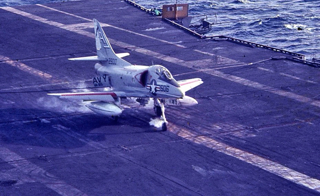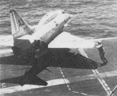 205k | A U.S. Navy Douglas A-4C Skyhawk of Attack Squadron (VA) 12 "Flying Ubangis" launching from the aircraft carrier USS Shangri-La (CVS-38). VA-12 was assigned to Carrier Air Wing (CVW) 8 aboard Shangri-La for a deployment to Vietnam from 5 March to 17 December 1970. U.S. Navy photo from the Shangri-La 1970 Cruise Book. |