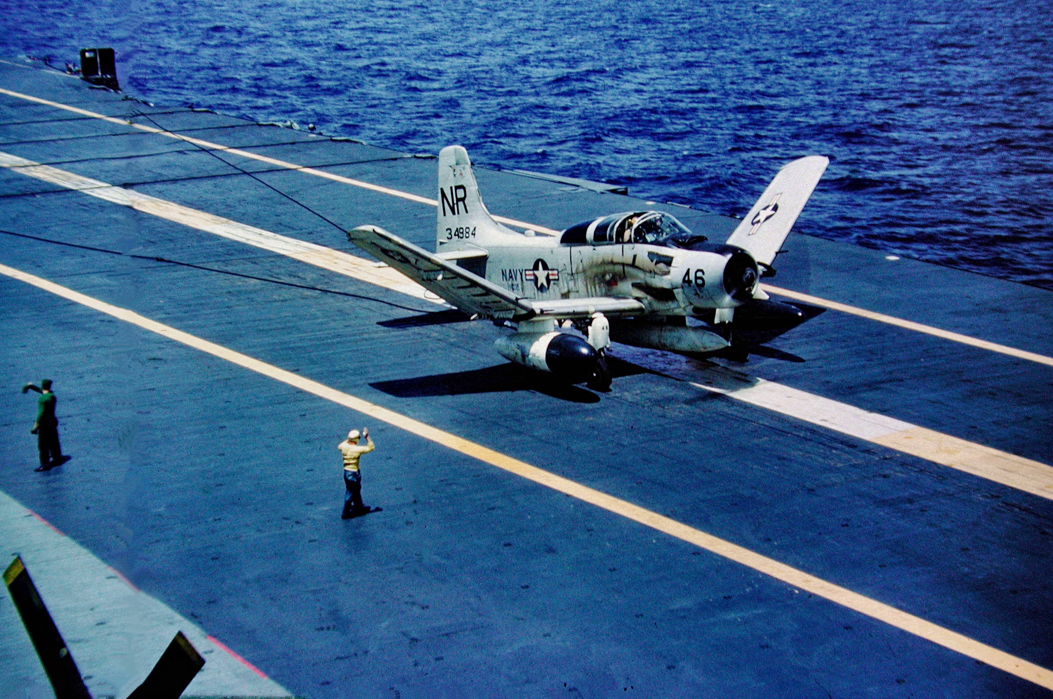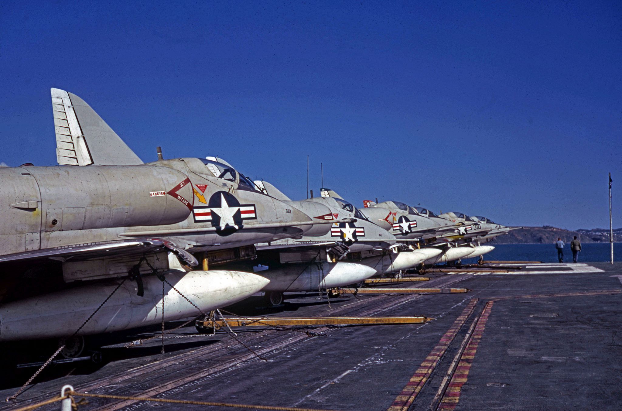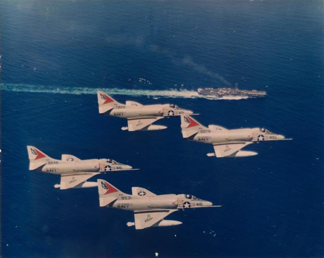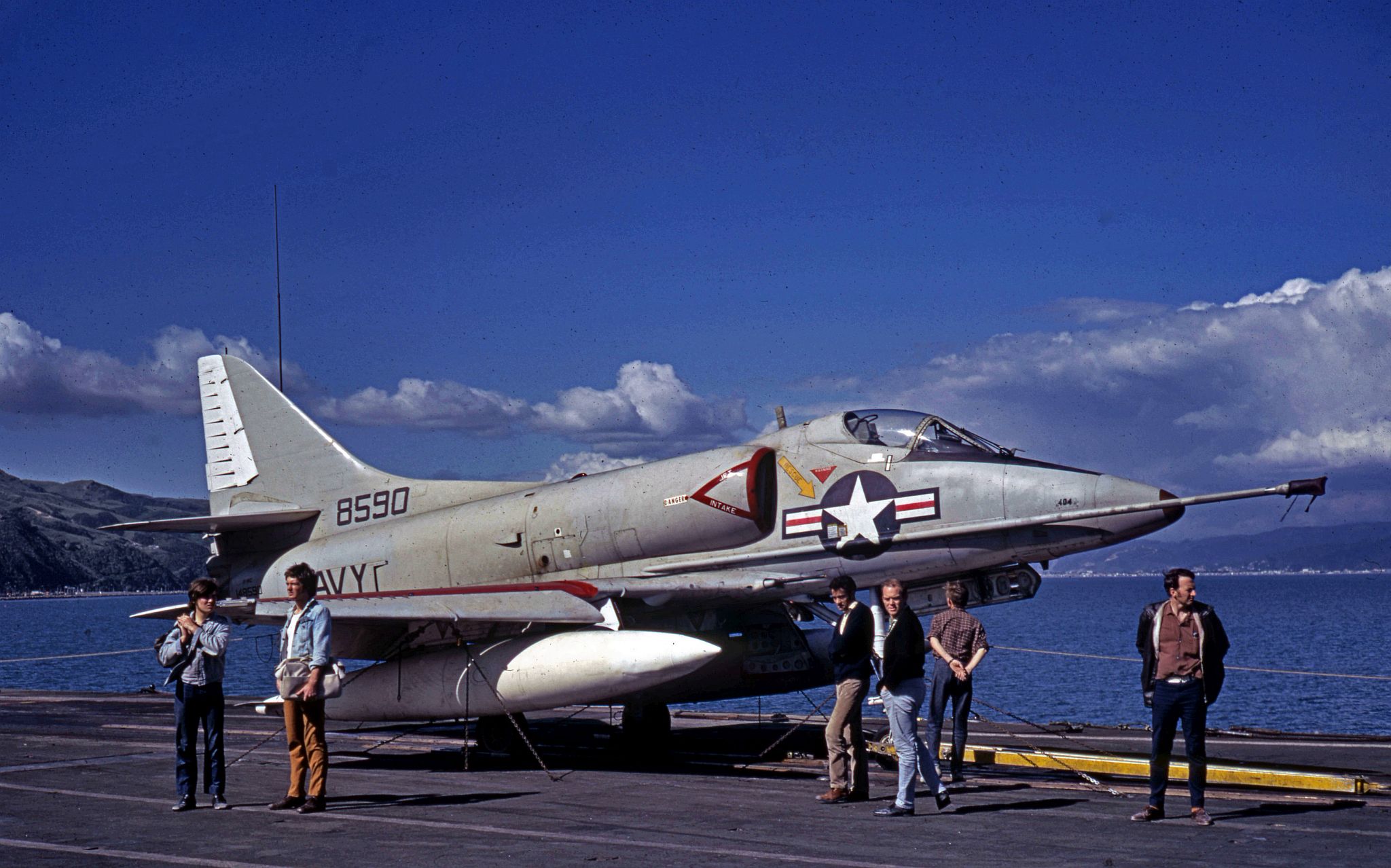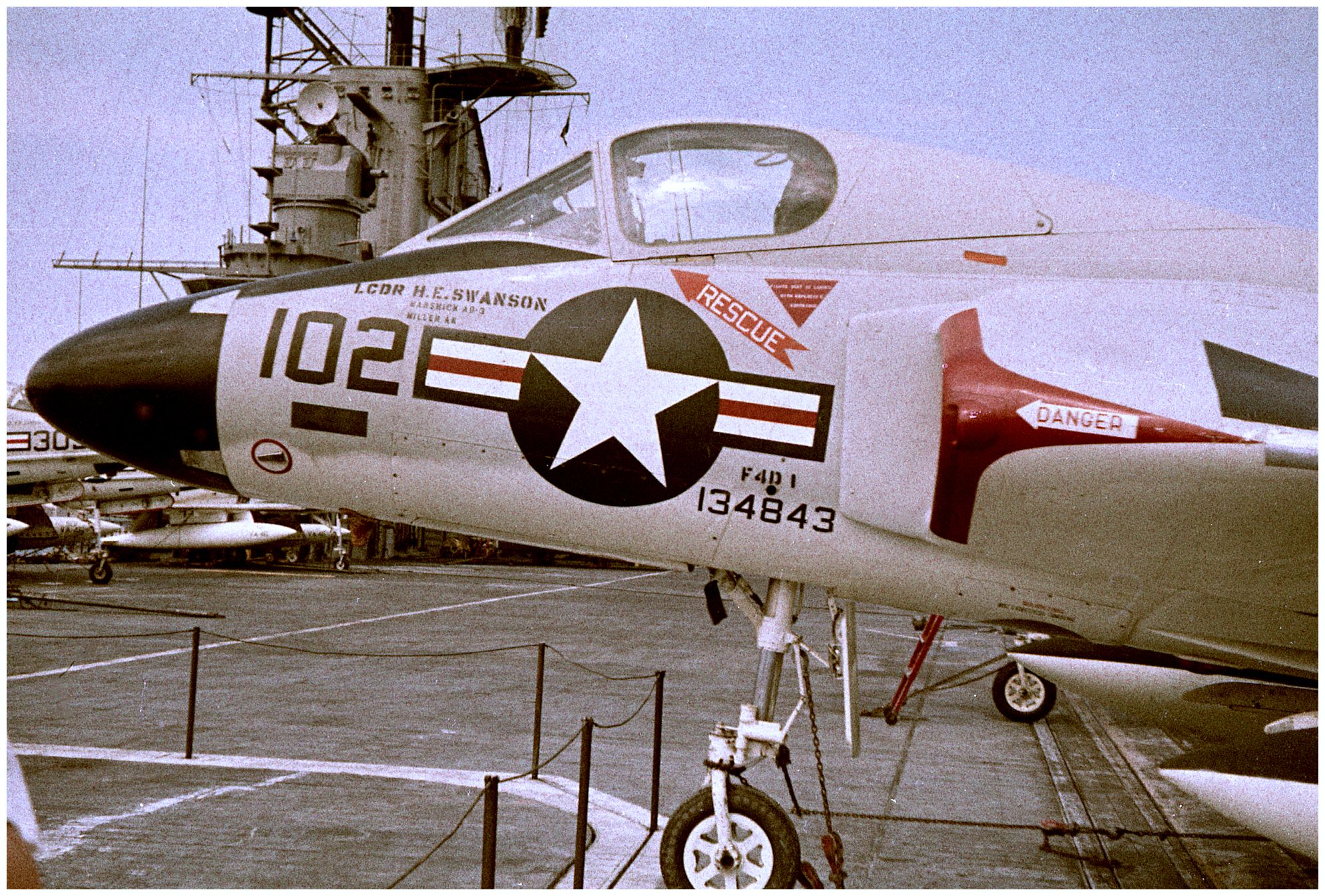 495k | USS Shangri-La (CVS-38), with embarked Carrier Air Wing (CVW) 8. Wellington, New Zealand, 22–24 November 1970. NS0238bda: The ship's COD plane, C-1A Trader BuNo 136783, modex 000, can be seen just abaft the island. This aircraft was one of four airframes modified by Grumman to train personnel in Electronic Counter Measures (ECM) tasks, with the designation EC-1A (TF-1Q under the pre-1962 designation system). NS0238bdb: A-4C Skyhaws attached to Attack Squadrons (VA) 172 "Blue Bolts" (side numbers 3xx) and 12 "Flying Ubangis" (4xx). Front to back: AJ-307 (BuNo 148513), AJ-314 (149498), unknown, AJ-303(?) (148528?), AJ-310 (unknown), and AJ-414 (148609). NS0238bdc: A-4C Skyhawh BuNo 148590, modex AJ-404, Attack Squadron (VA) 12 "Flying Ubangis." Preserved at Reno-Stead Airport, NV. Photos by Jenny Scott. |