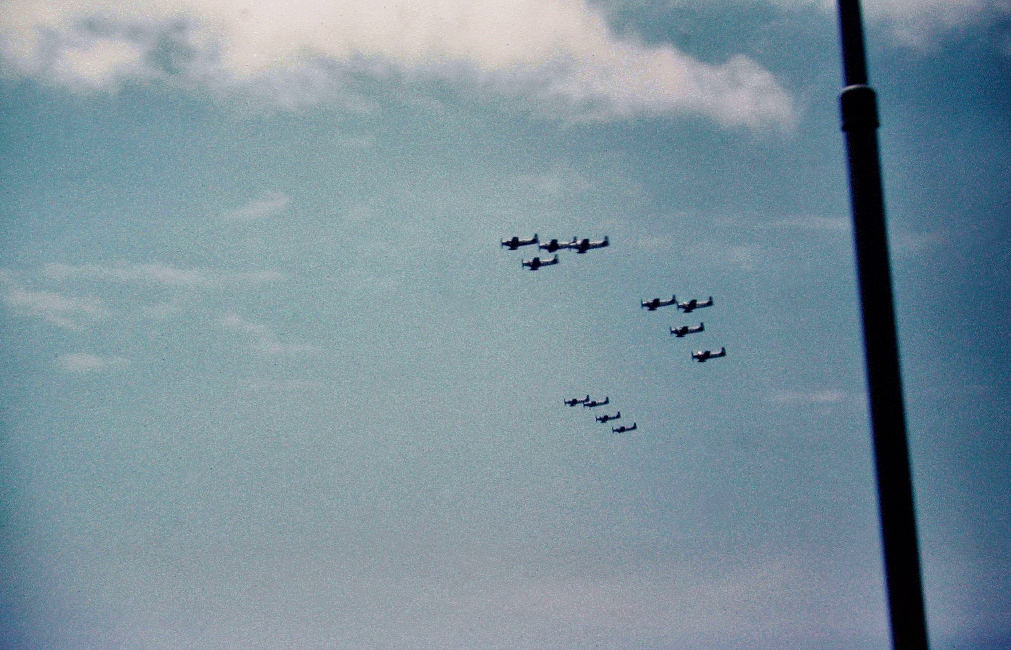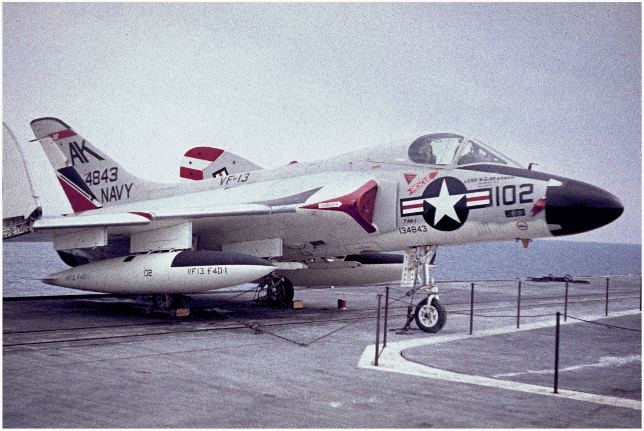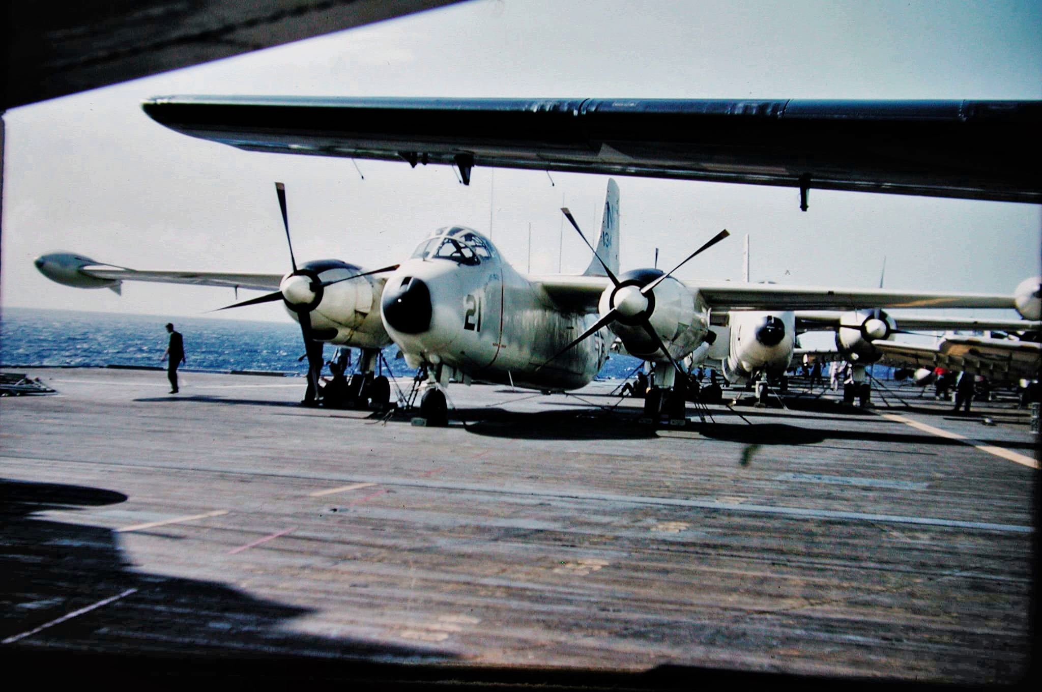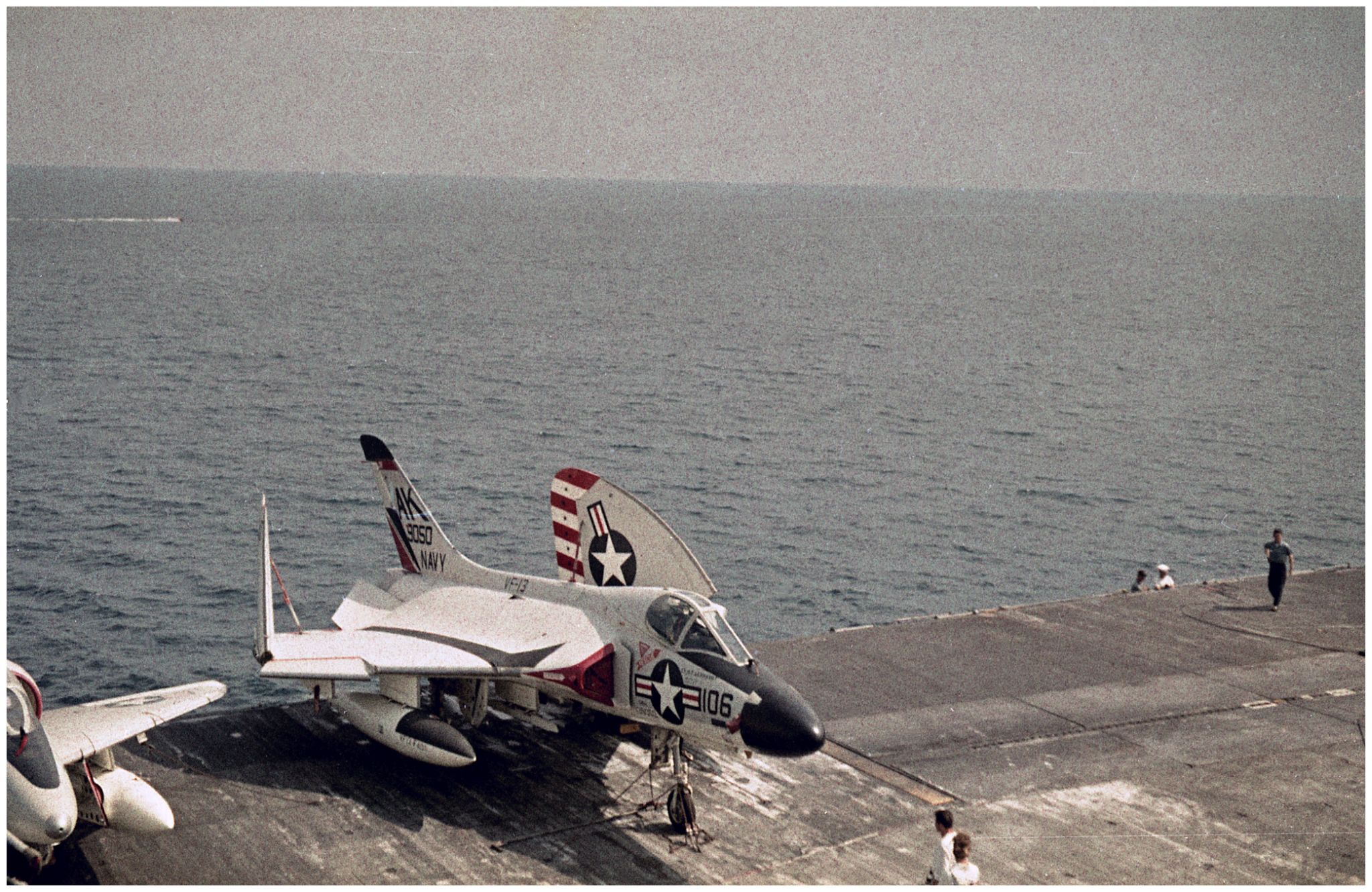 495k | USS Shangri-La (CVS-38), with embarked Carrier Air Wing (CVW) 8. Wellington, New Zealand, 22–24 November 1970. NS0238bda: The ship's COD plane, C-1A Trader BuNo 136783, modex 000, can be seen just abaft the island. This aircraft was one of four airframes modified by Grumman to train personnel in Electronic Counter Measures (ECM) tasks, with the designation EC-1A (TF-1Q under the pre-1962 designation system). NS0238bdb: A-4C Skyhaws attached to Attack Squadrons (VA) 172 "Blue Bolts" (side numbers 3xx) and 12 "Flying Ubangis" (4xx). Front to back: AJ-307 (BuNo 148513), AJ-314 (149498), unknown, AJ-303(?) (148528?), AJ-310 (unknown), and AJ-414 (148609). NS0238bdc: A-4C Skyhawh BuNo 148590, modex AJ-404, Attack Squadron (VA) 12 "Flying Ubangis." Preserved at Reno-Stead Airport, NV. Photos by Jenny Scott. |