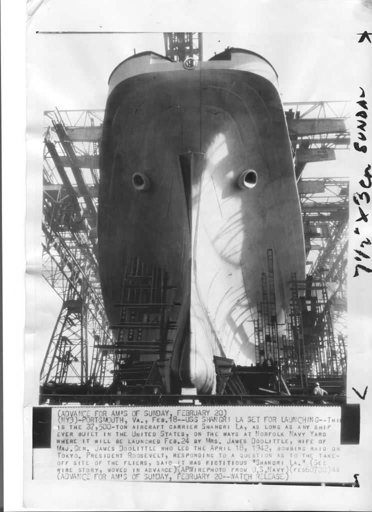 129k | "PORTSMOUTH, Va., Feb.18[, 1944]--USS SHANGRI LA SET FOR LAUNCHING--This is the 27,500-ton aircraft carrier Shangri La, as long as any ship ever built in the United States, on the ways at Norfolk Navy Yard where it will be launched Feb.24 by Mrs. James Doolittle, wife of Maj.Gen. James Doolittle who led the April 18, 1942, bombing raid on Tokyo. President Roosevelt, responding to a question as to the take-off site of the fliers, said it was fictious 'Shangri La.'" APWirephoto from U.S. Navy. |
