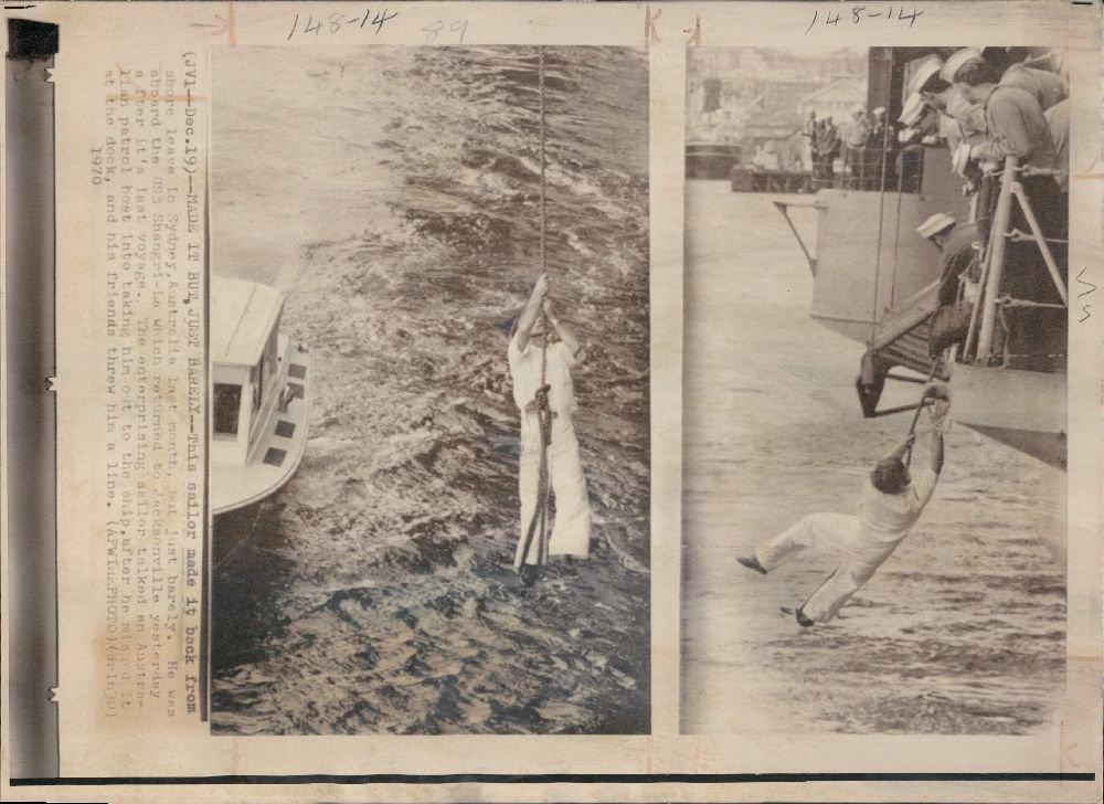 115k | "MADE IT BUT JUST BARELY—This sailor made it back from shore leave in Sydney, Australia last month, but just barely. He was aboard the USS Shangri-La which returned to Jacksonville yesterday after its last voyage. The enterprising sailor talked an Australian patrol boat into taking him out to the ship, after he missed it at the dock, and his friends threw him a line." (APWIREPHOTO, 19 December 1970.) |