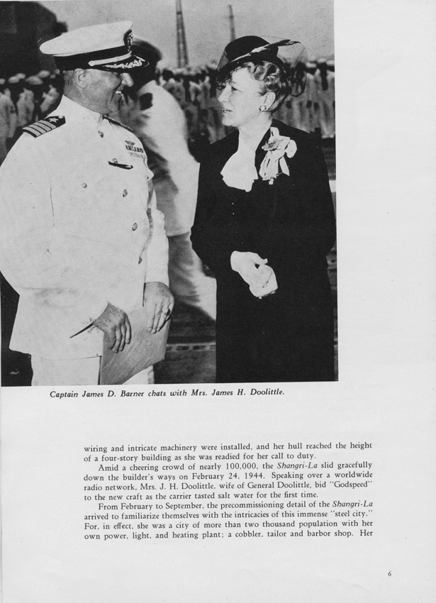 178k | Shangri-La (CV-38) launching ceremonies at the Portsmouth Navy Yard, Portsmouth, Virginia, with Mrs. James Doolittle, wife of the Major General, as sponsor. Mrs. James Doolittle is shown on the launching stand. Left to right: Governor Colgate W. Darden Jr.; Mrs. Doolittle; Captain J.E. Manch; Rear Admiral Felix X. Gygax, USN, Commandant of the Norfolk Navy Yard; and Mary Louise McClellan, daughter of a Navy Yard workman, who served as flower girl. Photograph released 24 February 1944. U.S. Navy Photograph, now in the collections of the National Archives and Records Administration (NARA), # 80-G-216111. |