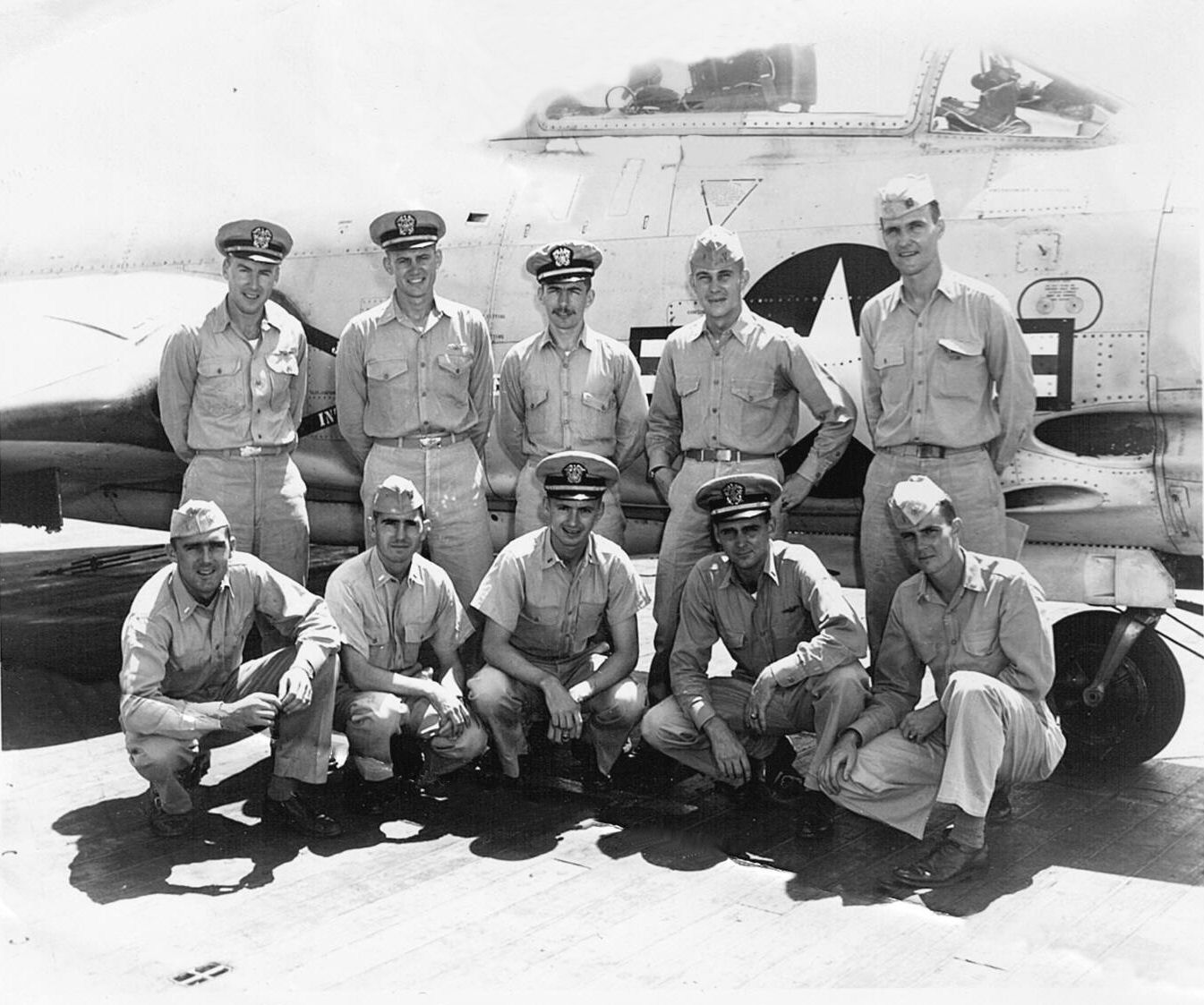 323k | A North American P-51D Mustang about to be launched from the deck of USS Shangri-La, November 1944, during Navy evaluation tests as to the suitability of the Mustang for carrier service (USN). There is a story about a P-51D Mustang and a Bearcat [(F8F)] taking off side by side from a standing start for a mock dogfight. The Bearcat reportedly had made two passes at the Mustang before the latter had raised its flaps and wheels. Text from Aircraft Carriers, by Norman Polmar. "Lieutenant Robert Elder on the deck of the carrier Shangri-La (CV-38) during trials of the extensively modified P-51D Mustang. He was one of the Navy's top test pilots." |