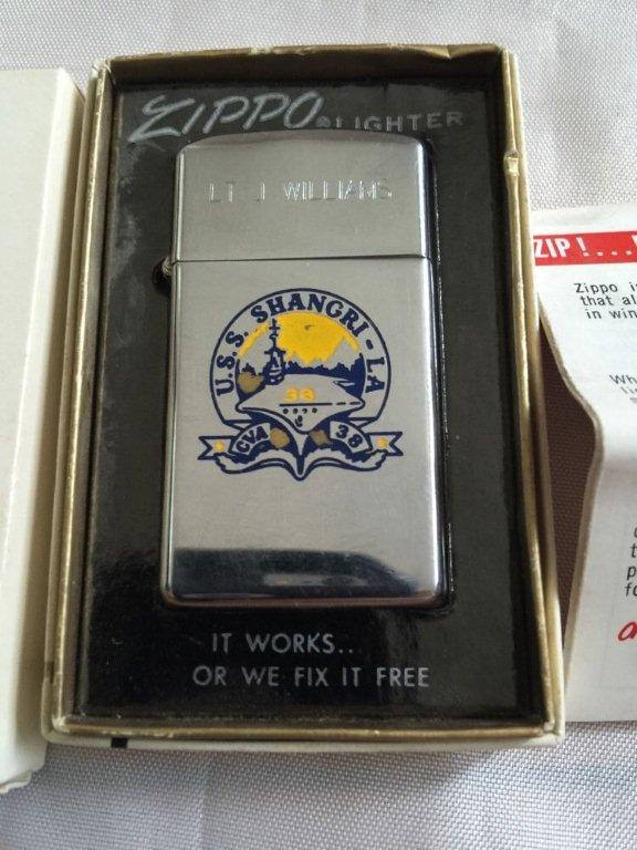 73k | USS Shangri-La (CVA-38) personalized Zippo Slim Lighter in box, 1969 vintage. |