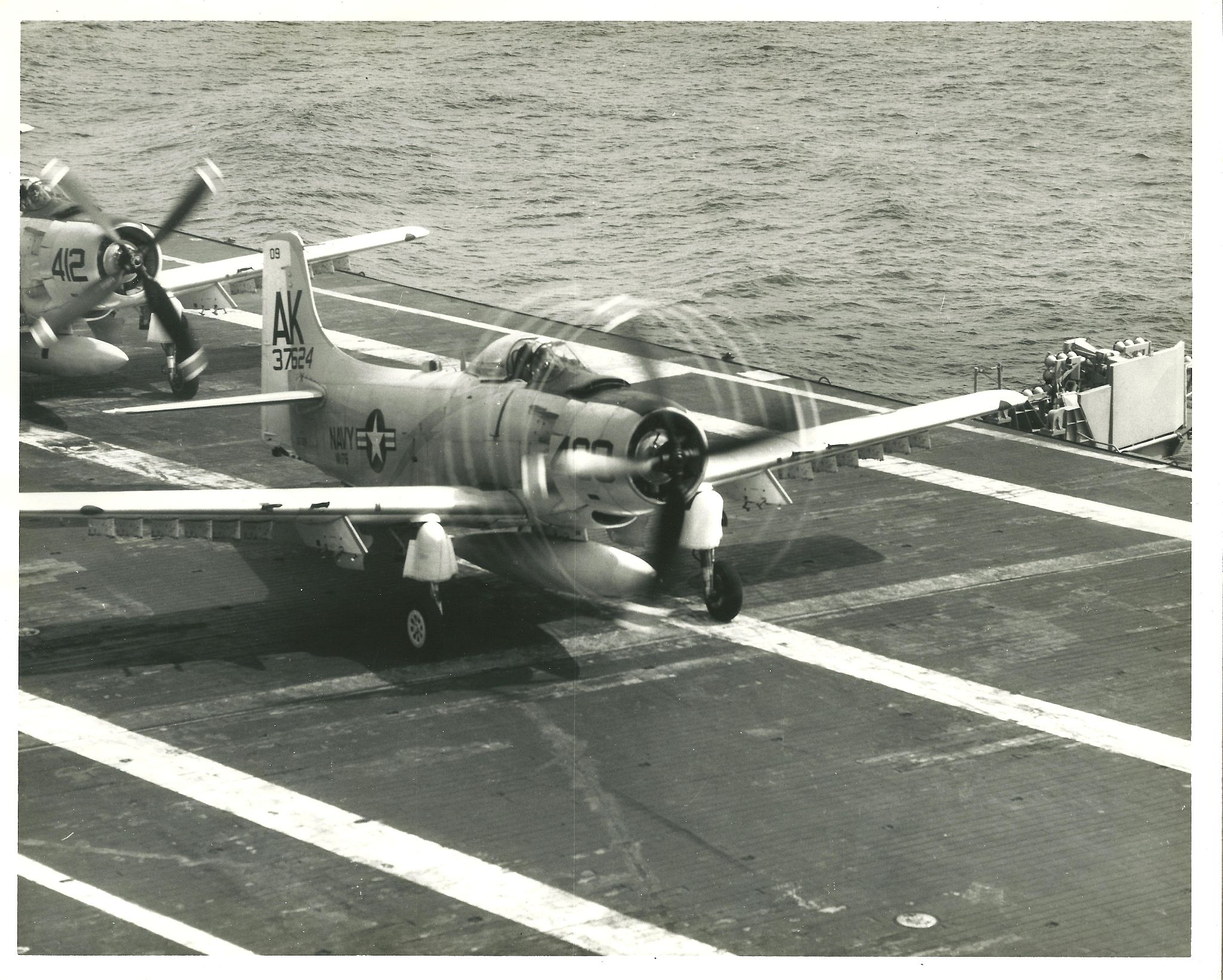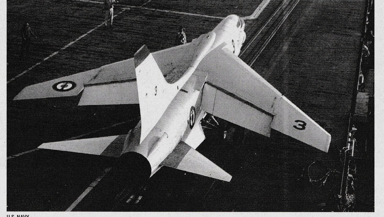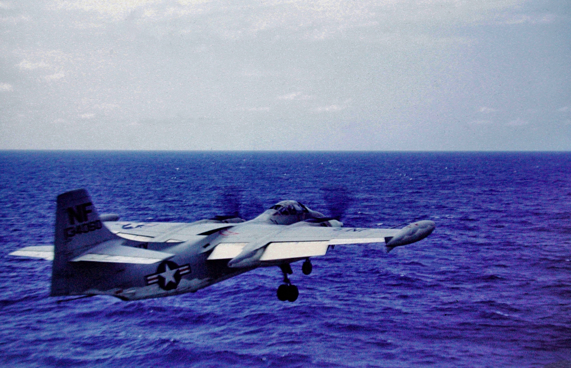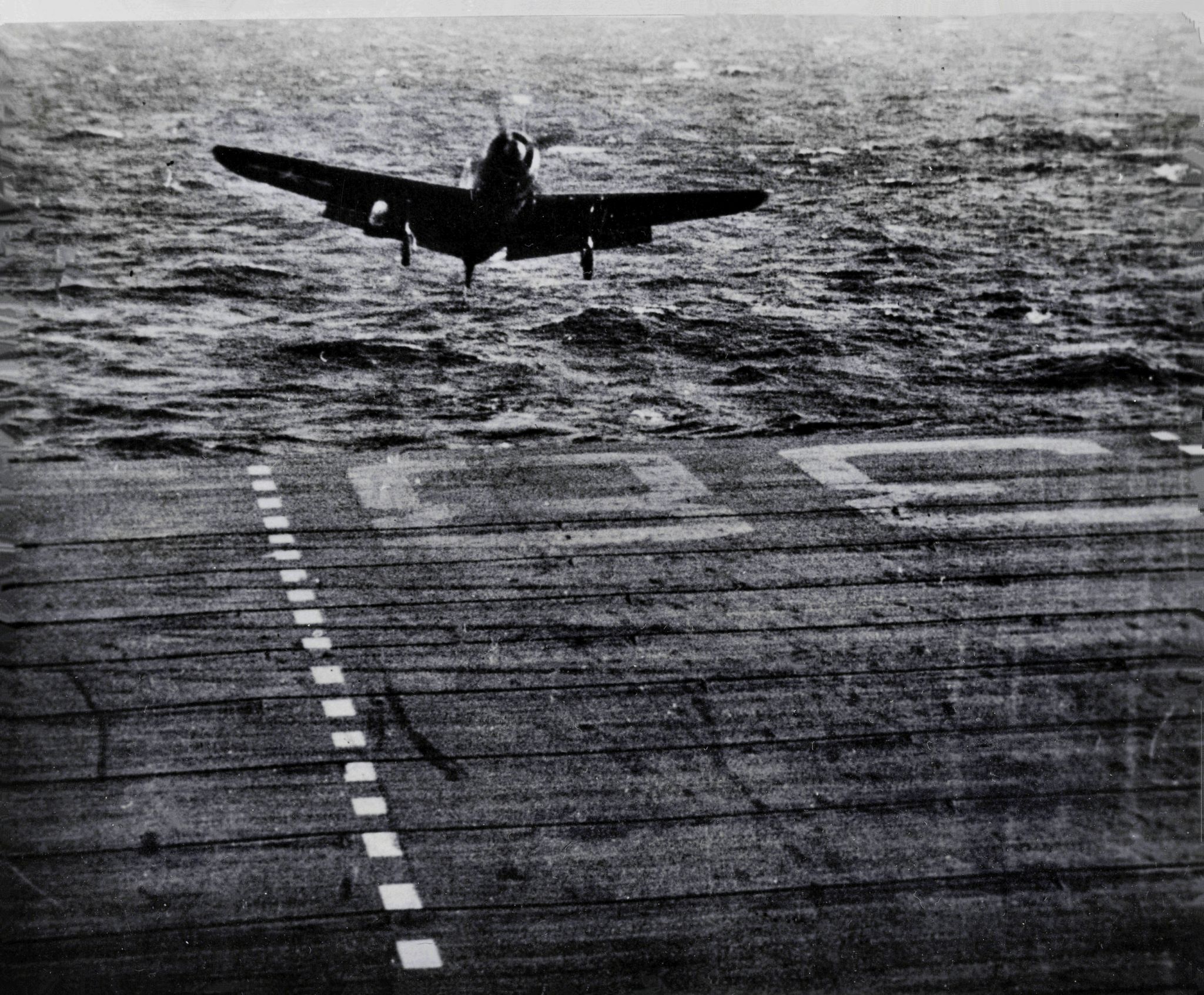 714k | F7F-1 Tigercat carrier landings (the first for a twin-engine, tricycle-landing-gear carrier aircraft) were conducted aboard USS Shangri-La (CV-38) on 15 November 1944. LT Charlie Lane, from the Ship Experimental Unit of the Naval Aircraft Factory (SEU/NAF) made deck-run and catapult take-offs, and arrested landings, in BuNo 80291. (See also NS0238-cj32.) Though the F7F-1 was successfully tested for carrier duty that day, it would never operate from a flattop. |