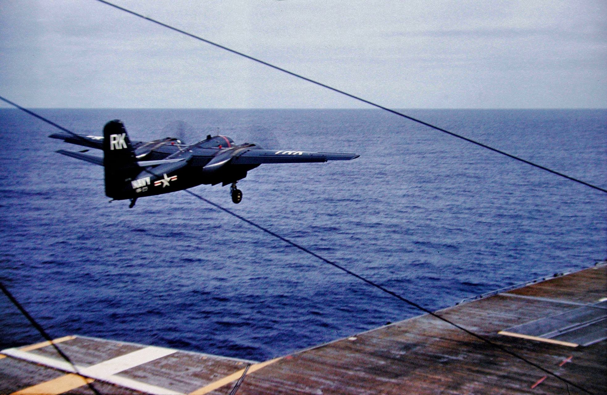 228k | A Grumman F7F-1 Tigercat (BuNo 80291) landing aboard USS Shangri-La (CV-38) during a test flight on 15 November 1944. U.S. Navy photo from the Shangri-La 1944–1946 Cruise Book. |