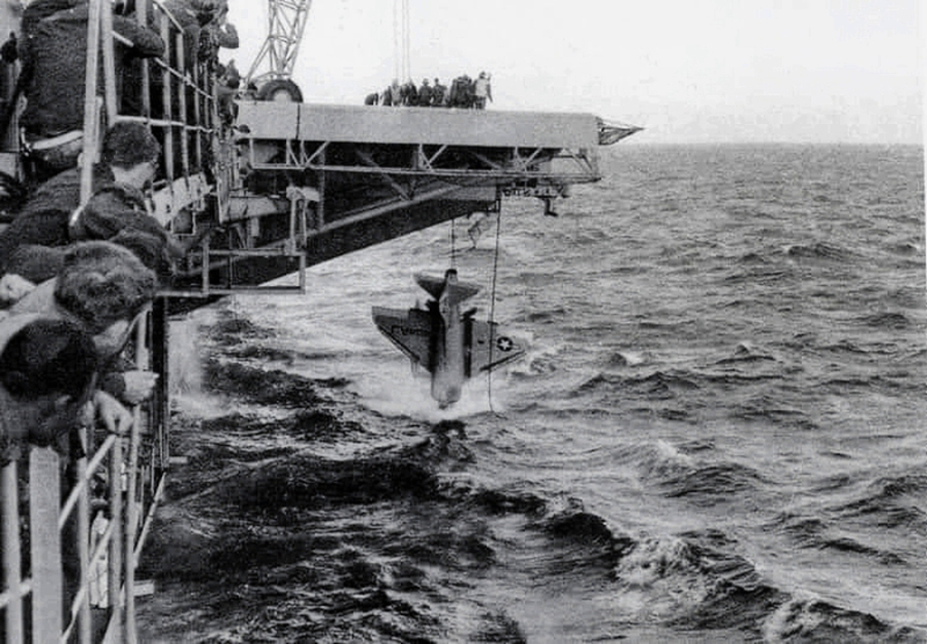 497k | North American P-51D-5-NA Mustang, #44-14017, redesignated EFT-51D and piloted by Navy LT Robert M. Elder, launching from USS Shangri-La (CV-38), during trials in November 1944. |
