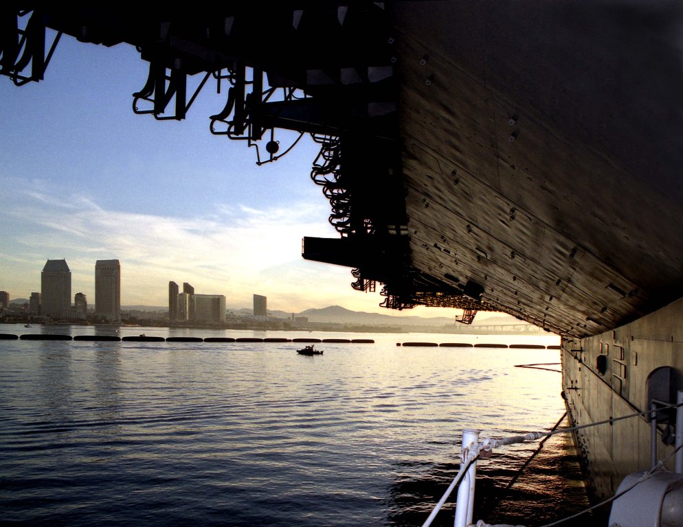 49k | Naval Air Station North Island, Calif., Jan 5, 2004 A tugboat tows the decommissioned aircraft carrier Midway into the San Diego bay. Midway will be moored temporarily at Naval Air Station North Island to take-on restored historical aircraft and will soon be home ported across the bay in San Diego, as the center piece for the United States' biggest museum devoted to carriers and naval aviation. When launched on September 10, 1945 as USS Midway (CVB-41) she was the largest carrier ever put to sea. For nearly 50 years she saw action in every major U.S. conflict to include military action in Korea, Vietnam, and Iraq. U.S. Navy photo by Photographer’s Mate 1st Class David Levy (# 040105-N-6811L-001). |