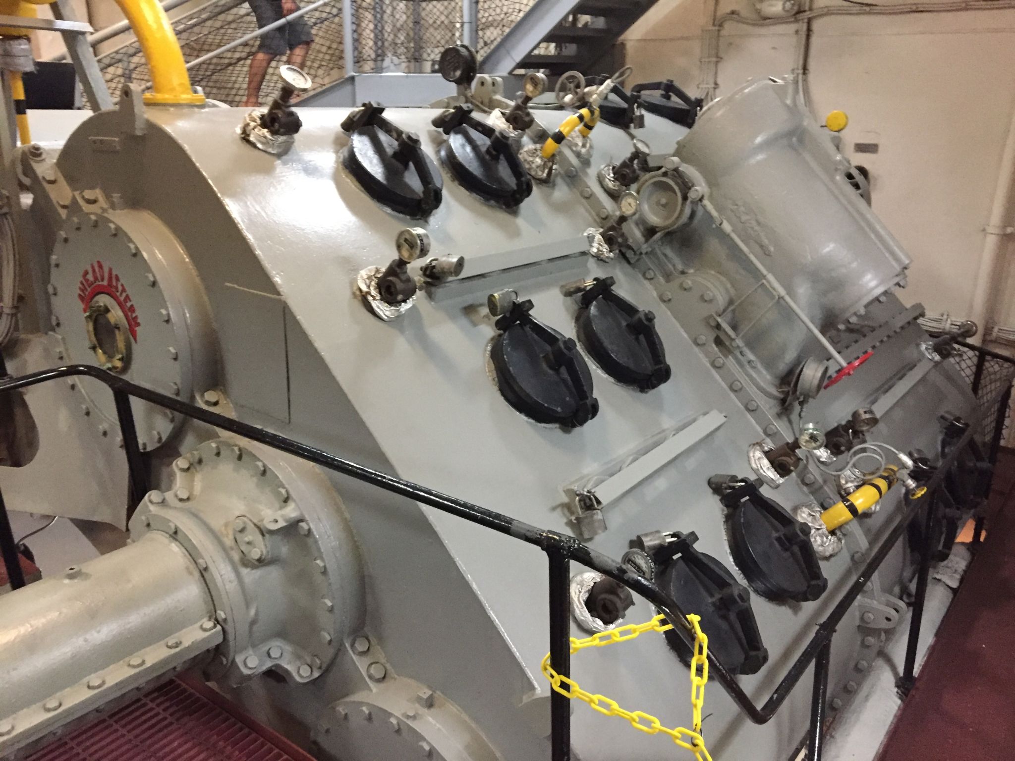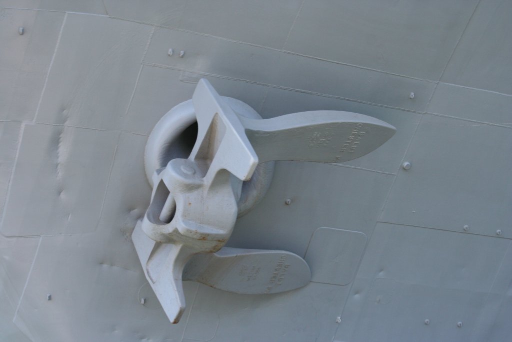 100k | USS Midway Museum Entrance. Note ports in ship's transom, through which anti-torpedo decoys (towed noisemakers) were trailed. |