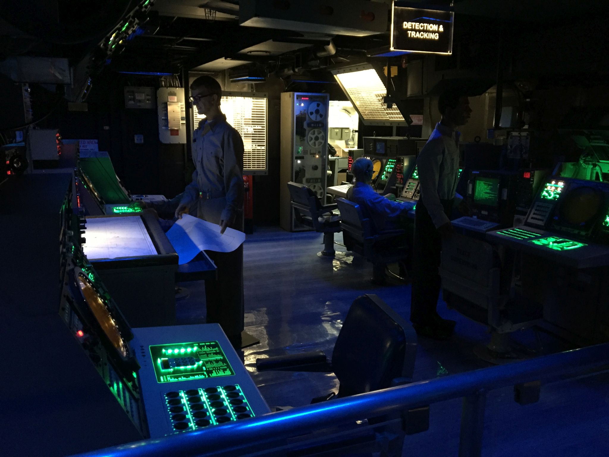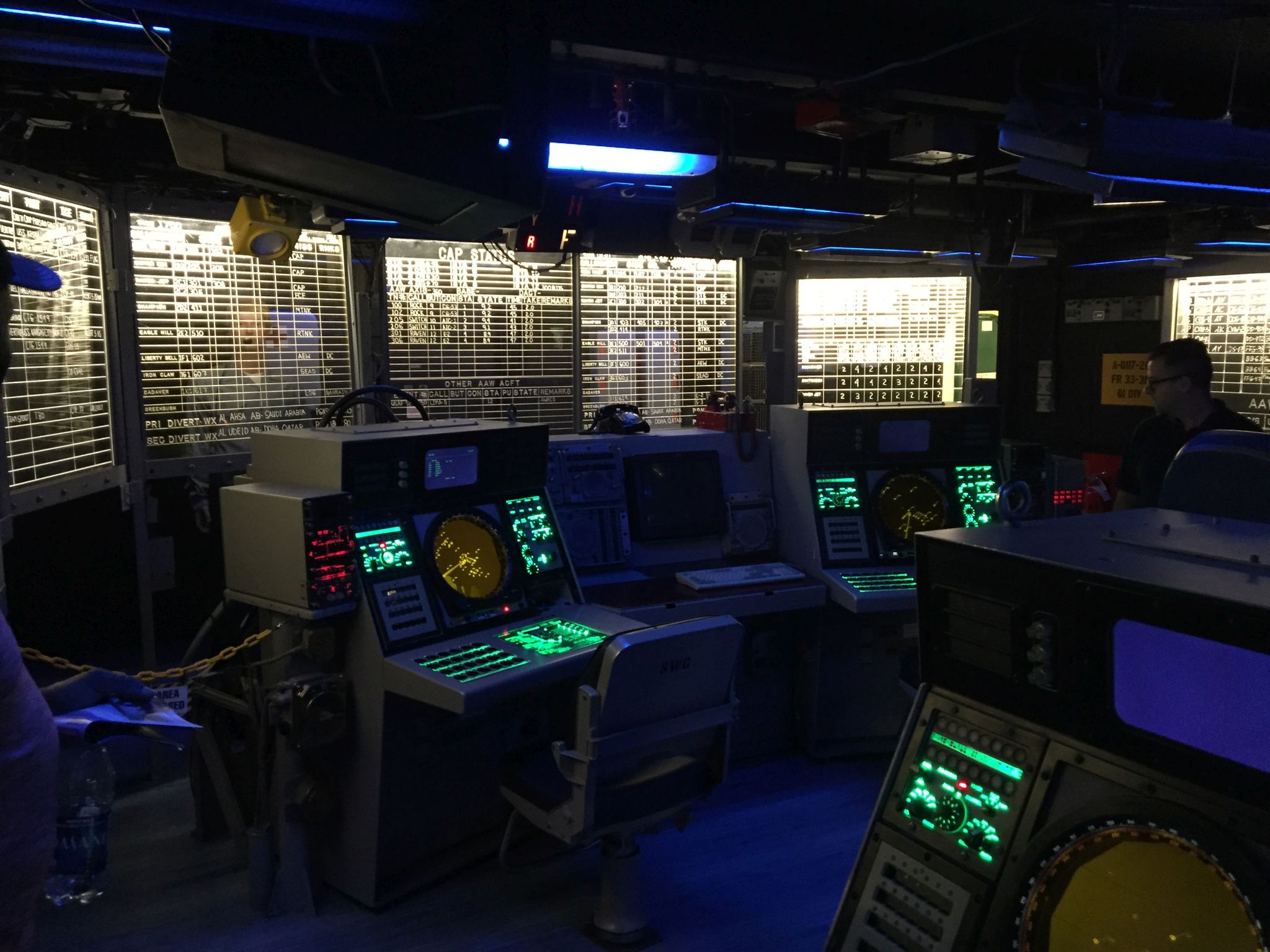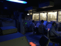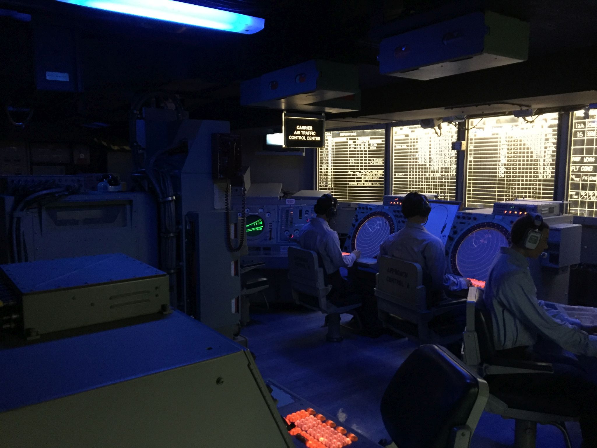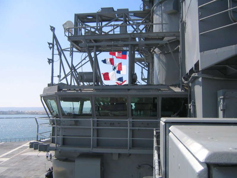 85k | "Pri-fly," looking forward. Primary Flight Control ("Pri-Fly") is the control tower for the flight operations on the carrier. Here, the "Air Boss" controls the takeoffs, landings, aircraft in the air near the ship, and the movement of planes on the flight deck. September 2005. |
