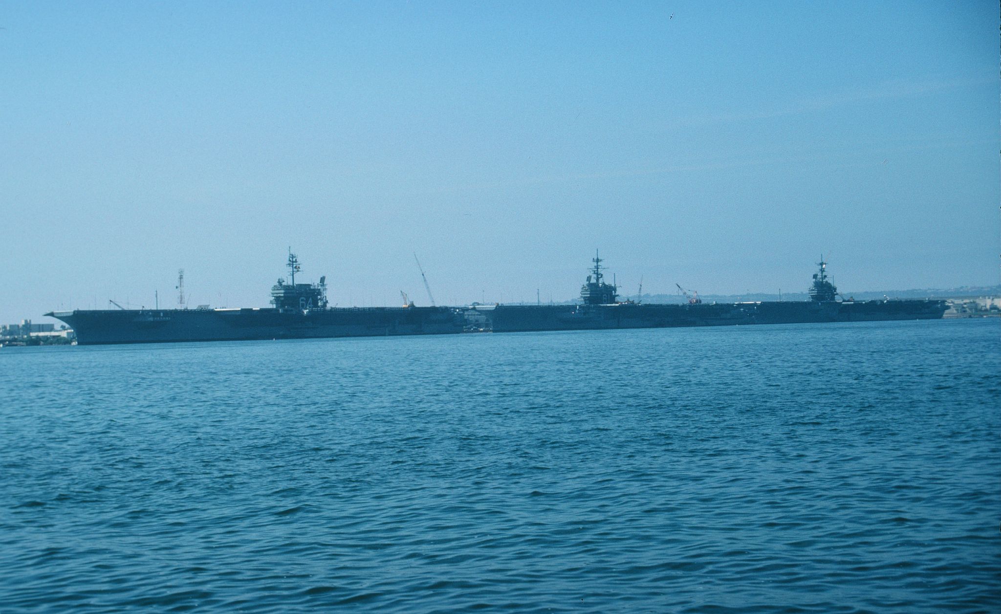 1.52M | Three aircraft carriers: USS Constellation (CV-64), USS Independence (CV-62) and USS Ranger (CV-61), docked at Naval Air Station North Island (NASNI), California. Circa second half of 1989, but exact date shot unknown. Photo by CWO Dale, USN. National Archives photo (DNSC0410879; NARA id: 6640125). |