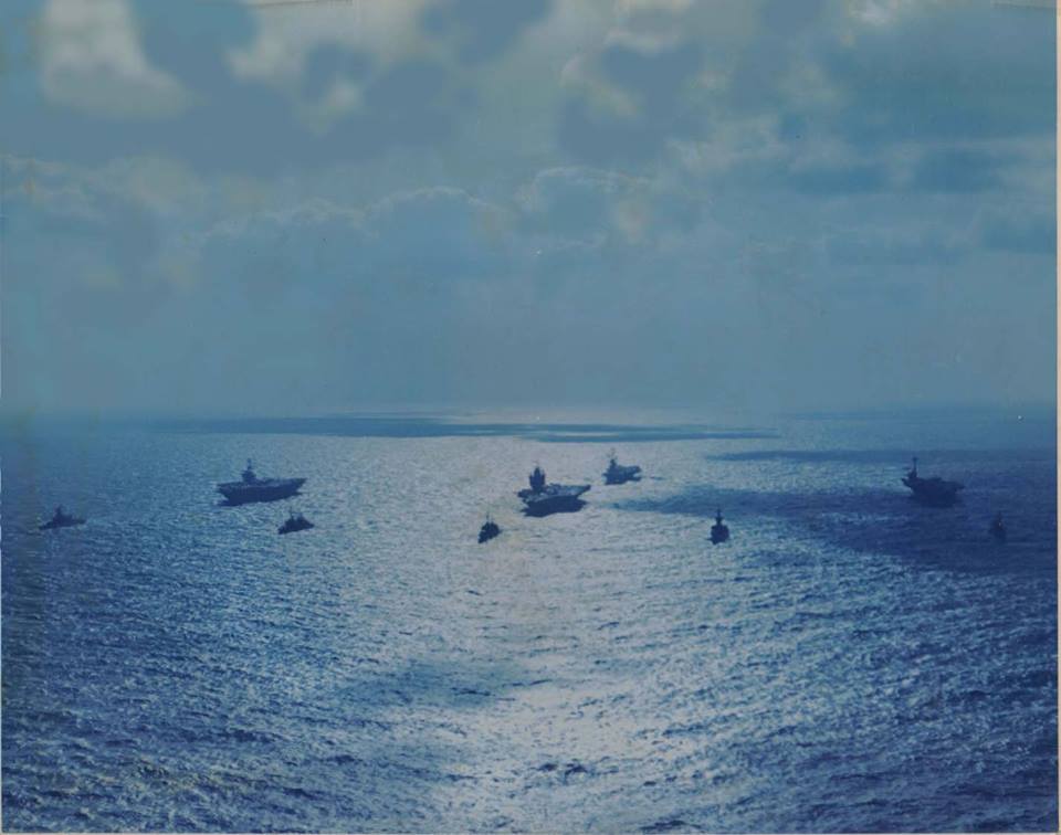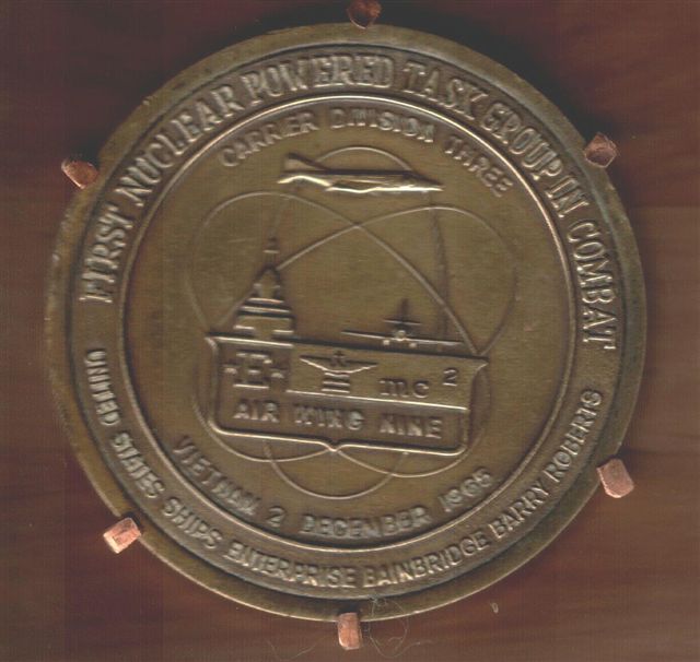 53k | Carrier Division Three, First Nuclear Powered Task Group in Combat, Vietnam, 2 December 1965. USS Enterprise (CVAN-65), with Carrier Air Wing Nine (CVW-9); USS Bainbridge (DLGN-25); USS Barry (DD-933); USS Samuel B. Roberts (DD-823). [On 2 December 1965] "Enterprise became the first nuclear powered warship to engage in combat operations when aircraft of Attack Carrier Air Wing NINE launched 118 sorties against the Viet Cong in South Vietnam. For the rest of the month, the Big E carried out a relentless campaign against the enemy, primarily in North Vietnam, blasting military facilities, transportation networks, military storage areas, and barges and junks carrying supplies to the Communist forces in South Vietnam." Quoted from the ship's Command History for 1965. |