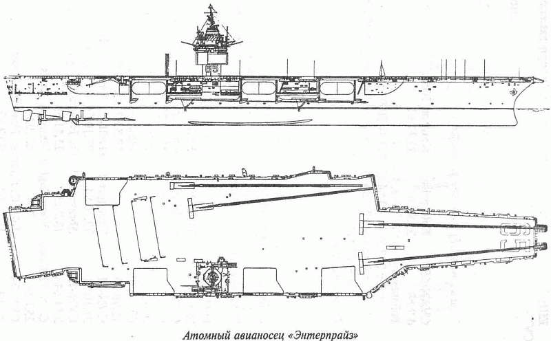 84k | "Nuclear-powered Aircraft Carrier Enterprise." (From a Russian publication). This drawing shows Enterprise as she appeared in the 1970s, still with her original, distinctive island structure supporting the SPS-32 and SPS-33 "billboard" radar antennas and topped by her unique conical ESM/ECM array. |