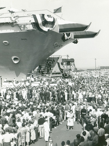 59k | The crowd, estimated at 24,000, attending the christening ceremony. One cool thing: as shown in the photo, the ship's name was spelled out in lights on both sides of the bow. During the ceremony the dry dock was being flooded. As a section of the ship floated off the keel blocks, a letter in the name would light up. When the final "E" lit up, signalling that Enterprise was afloat for the first time, Mrs. Franke christened the ship. |