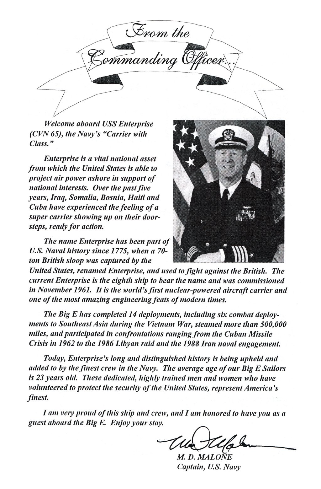 311k | "Welcome Aboard" letter from the Commanding Officer (1996–1997), Captain Michael D. Malone, USN. | Wolfgang Hechler | ||||||||||||||||