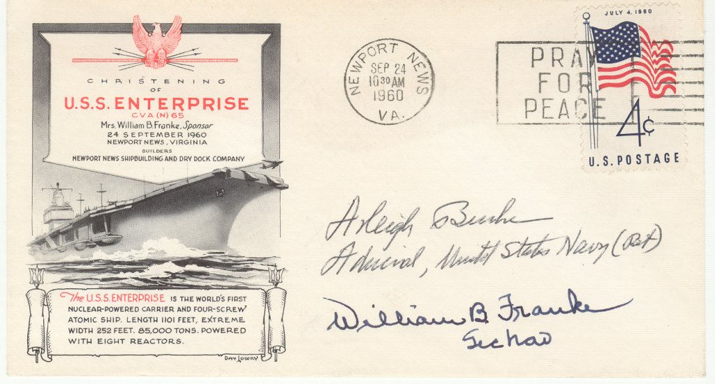 112k | Christening cachet signed by ADM Arleigh Burke, CNO at the time, and William B. Franke, SecNav, both speakers at the ceremony. |