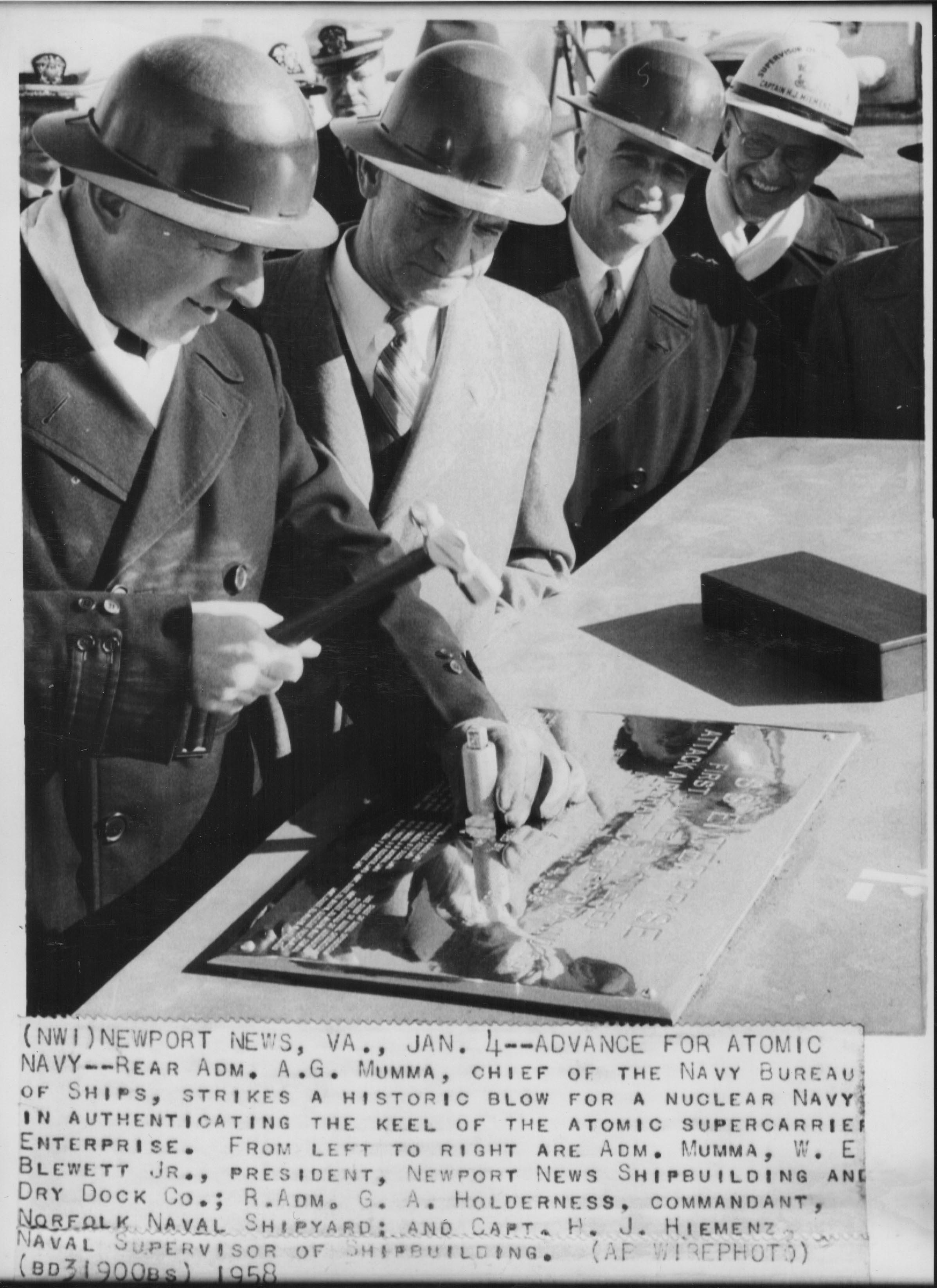 499k | "(NWI)NEWPORT NEWS, VA., JAN. 4[, 1958]—ADVANCE FOR ATOMIC NAVY— Rear Adm. A.G. Mumma, chief of the Navy Bureau of Ships, strikes a historic blow for a nuclear Navy in authenticating the keel of the atomic supercarrier Enterprise. From left to right are Adm. Mumma, W.E. Blewett Jr., president, Newport News Shipbuilding and Dry Dock Co.; R.Adm. G.A. Holderness, commandant, Norfolk Naval Shipyard; and Capt. H.J. Hiemenz, Naval Supervisor of Shipbuilding. (AP WIREPHOTO) (bd31900bs) 1958" From the files of the Vallejo Naval & Historical Museum (CVN 65 381X1-2-58 TH AP). |