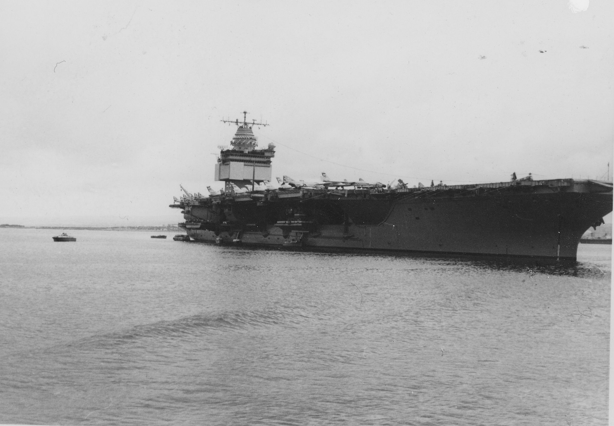 130k | USS Enterprise (CVAN-65), with Carrier Air Group (CVG) 1, docking at Mayport, Florida, on 7 February 1962. Destroyer USS Bigelow (DD-942) is at right. Naval History & Heritage Command (NH&HC) photo, # USN 1059452. |