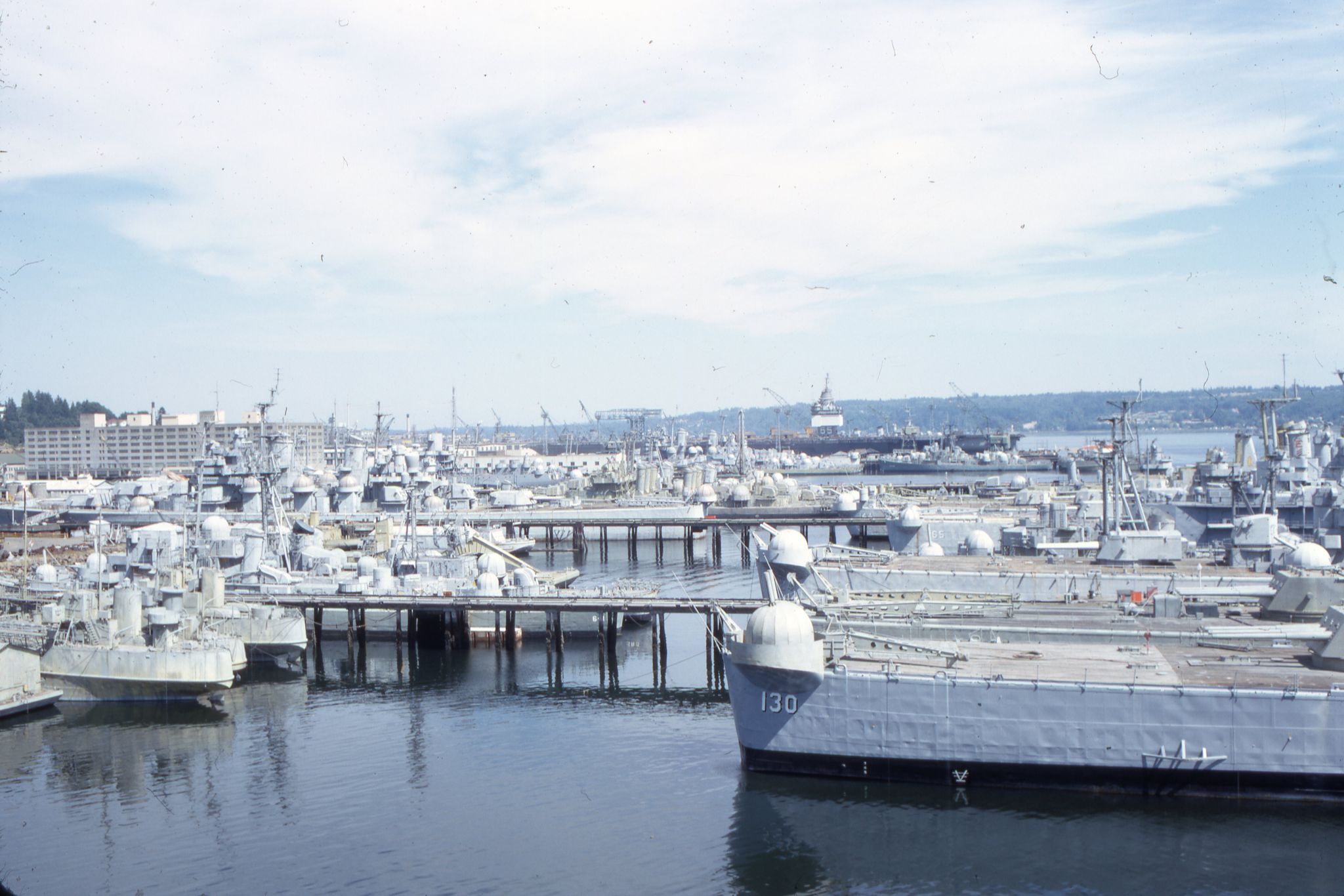 247k | Service craft tend to USS Enterprise (CVN-65) at Puget Sound Navy Yard, 1981. The Big E was undergoing structural alterations that began in 1979. National Naval Aviation Museum photo, # 1996.488.125.087. |