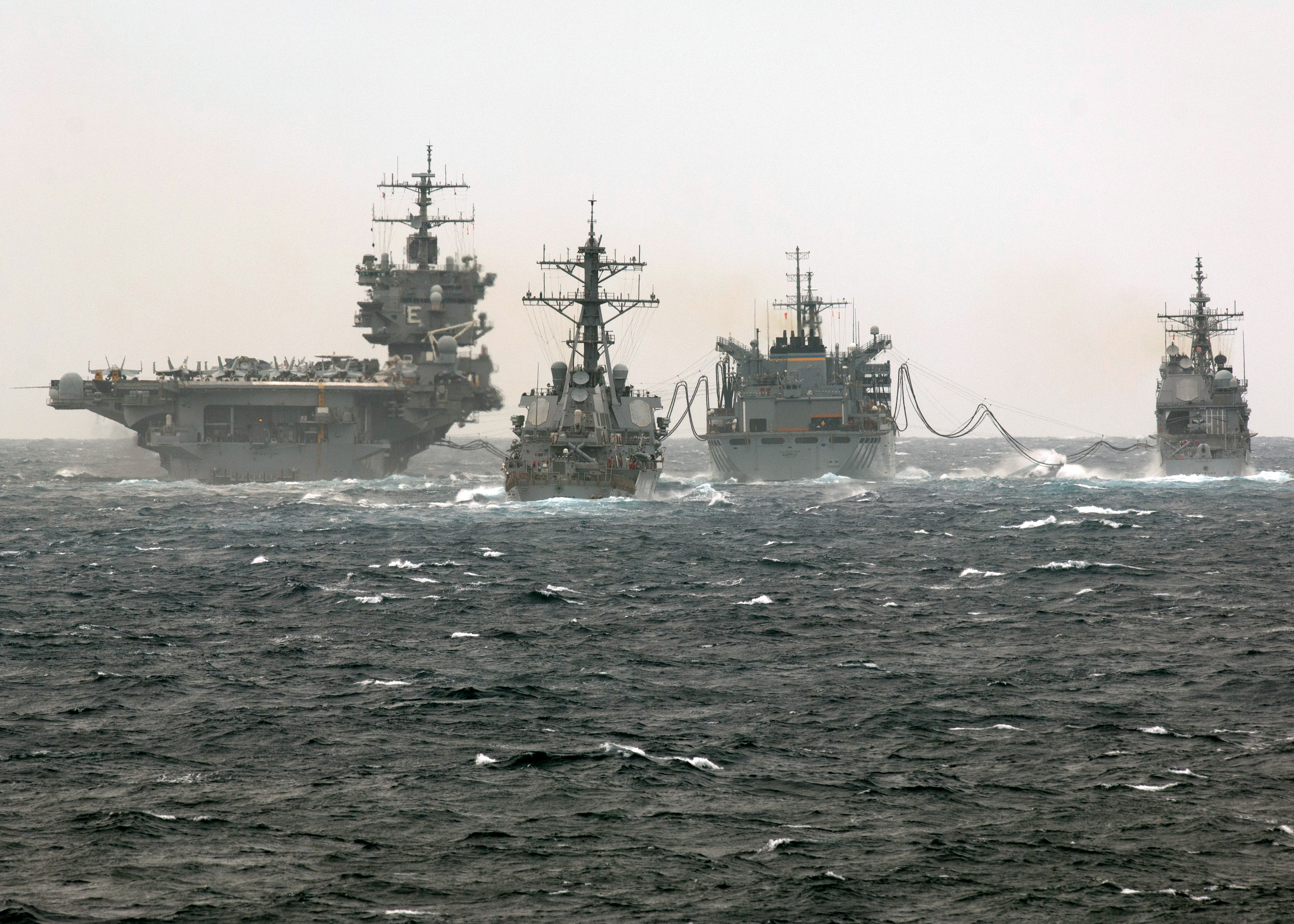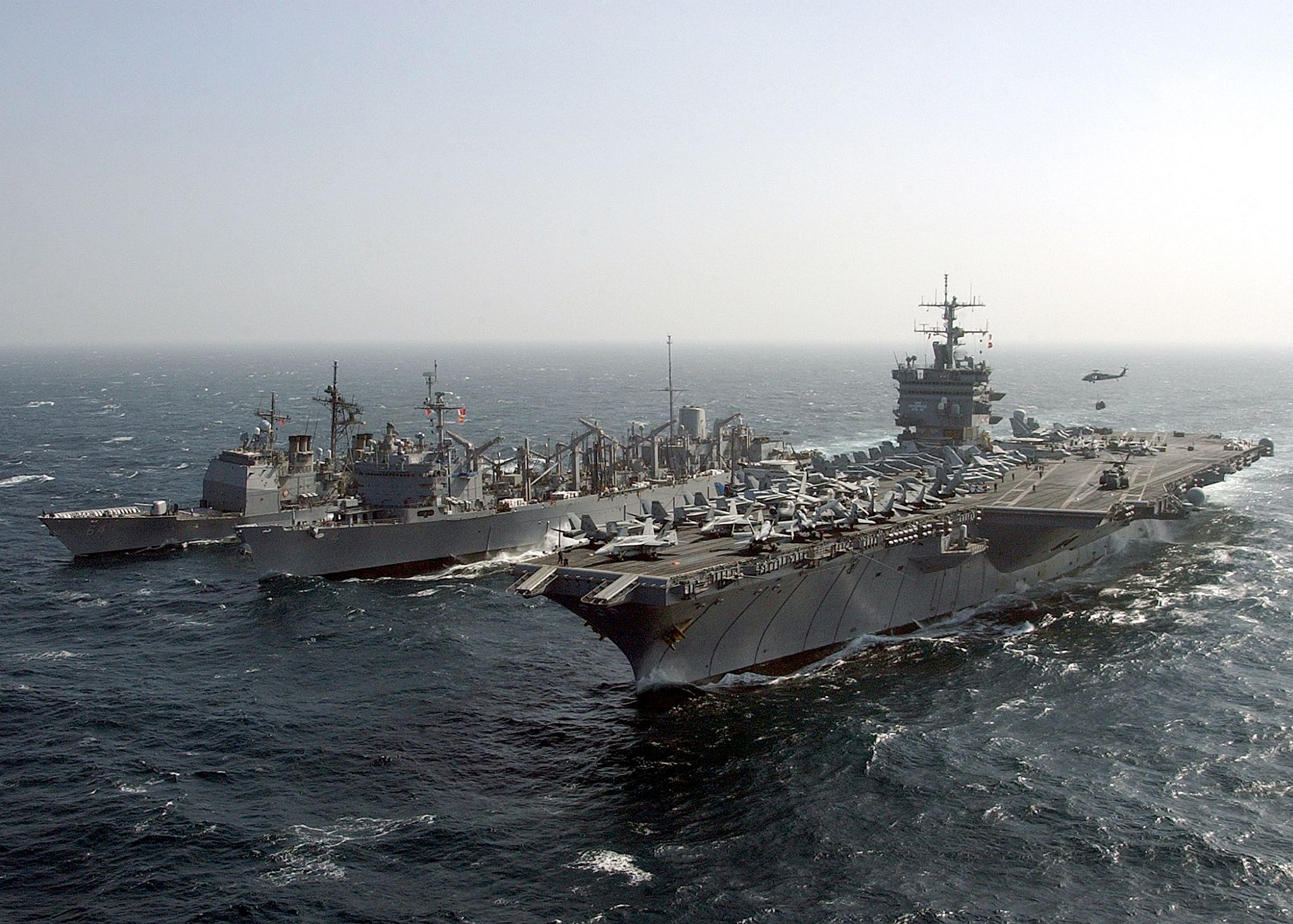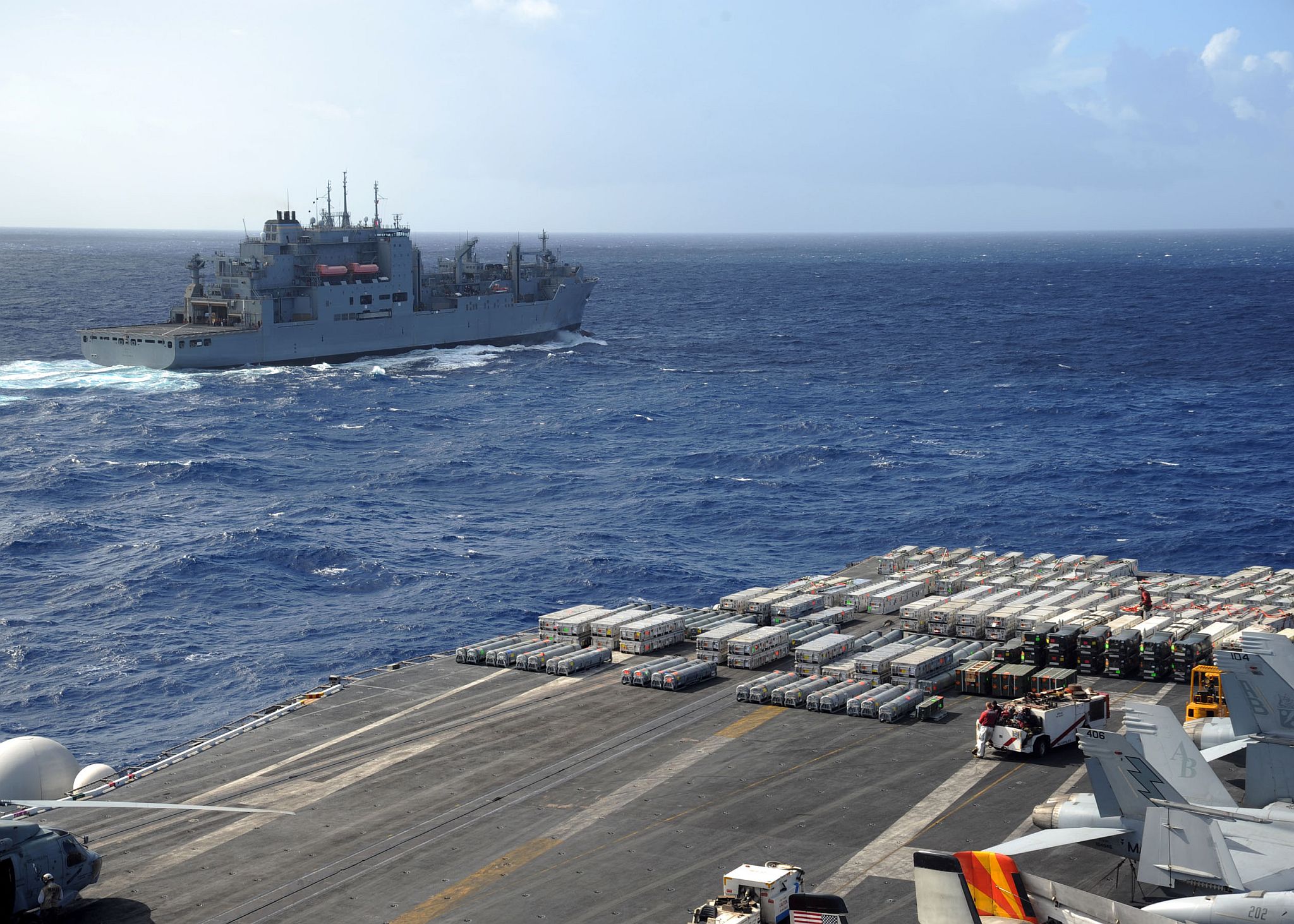 512k | USS Enterprise (CVN-65) approaches Military Sealift Command dry cargo and ammunition ship USNS Sacagawea (T-AKE 2) before a vertical replenishment and Enterprise's final ammunition offload, 24 October 2012. US Navy photo by Mass Communication Specialist 3rd Class Jared King (# 121024-N-CH661-019). |