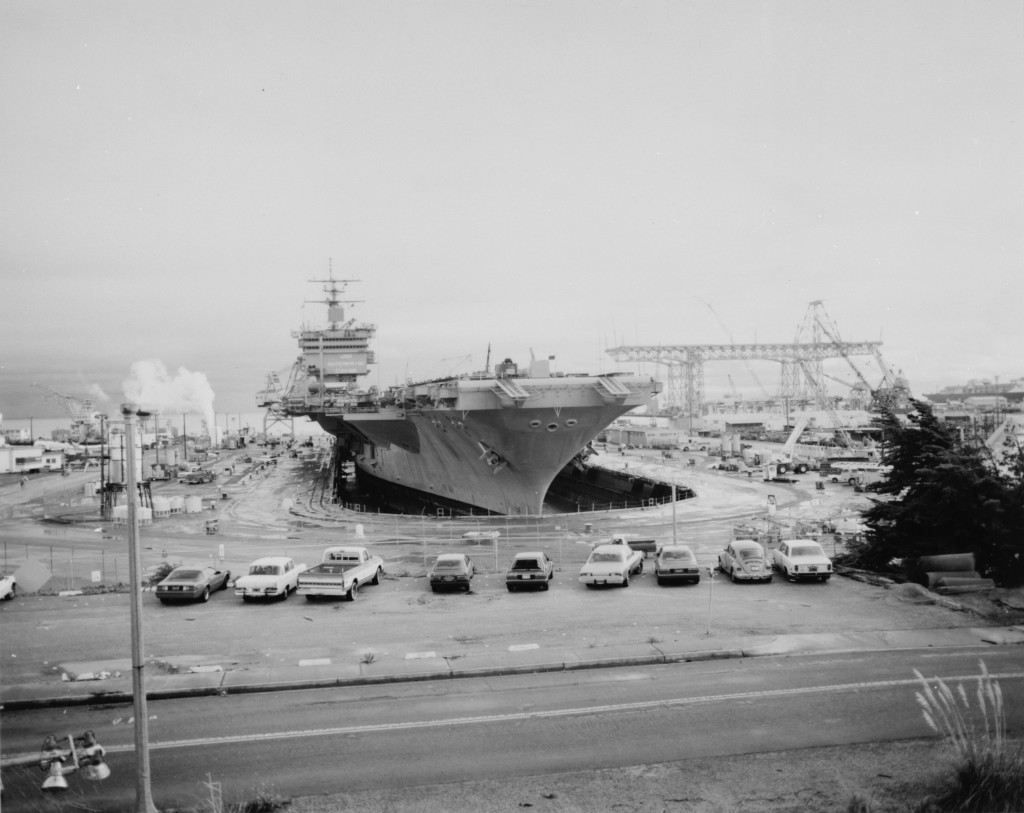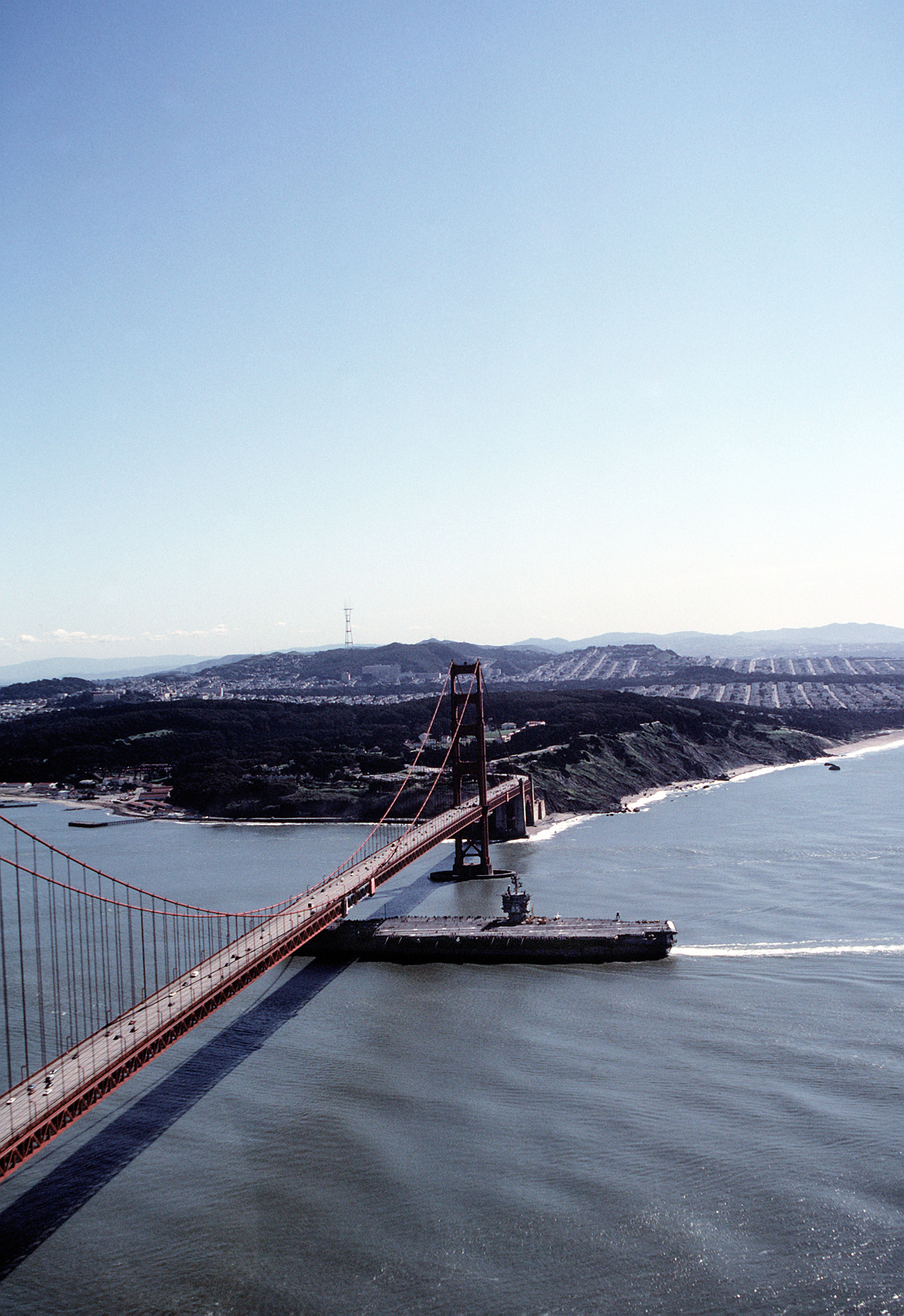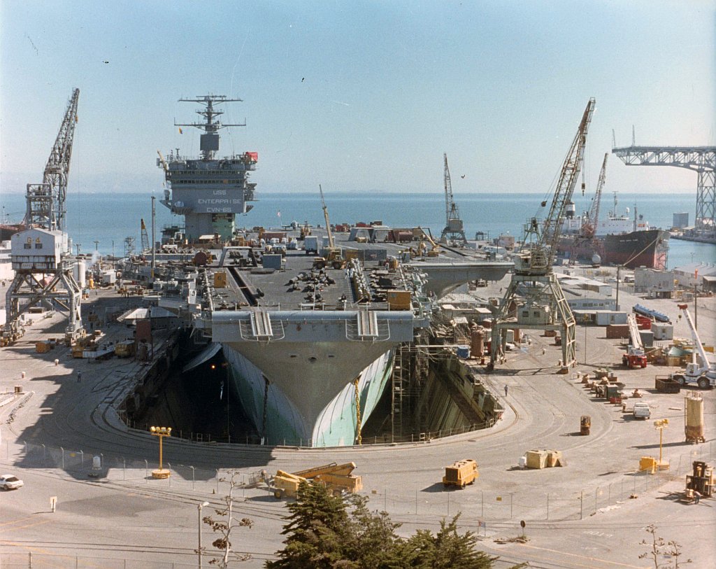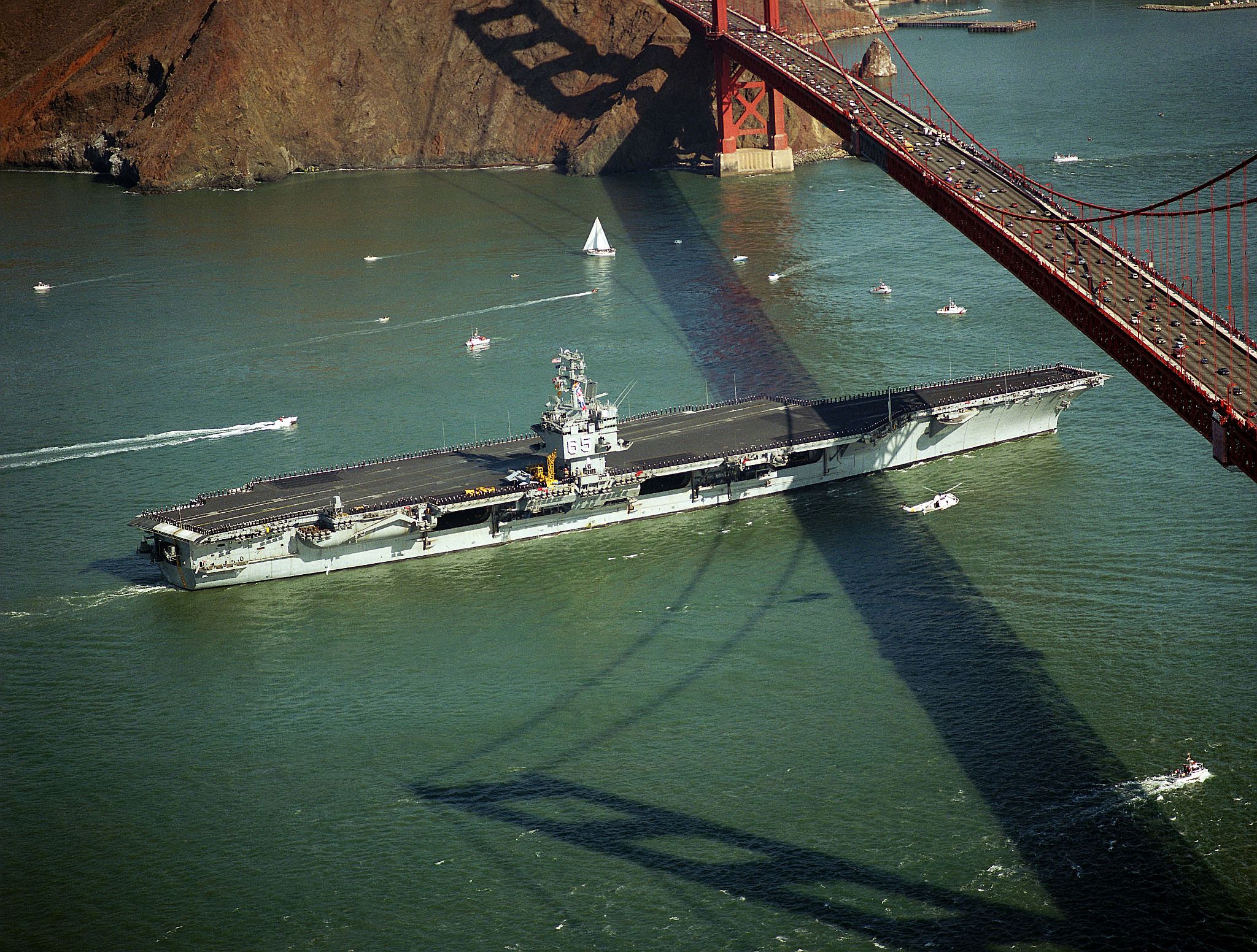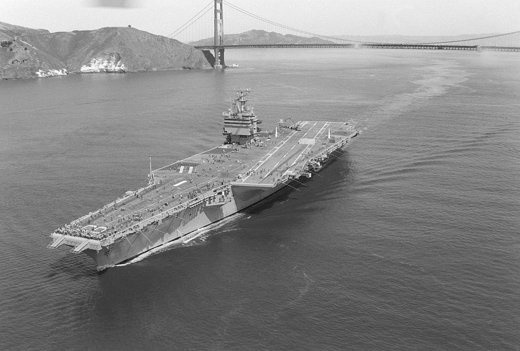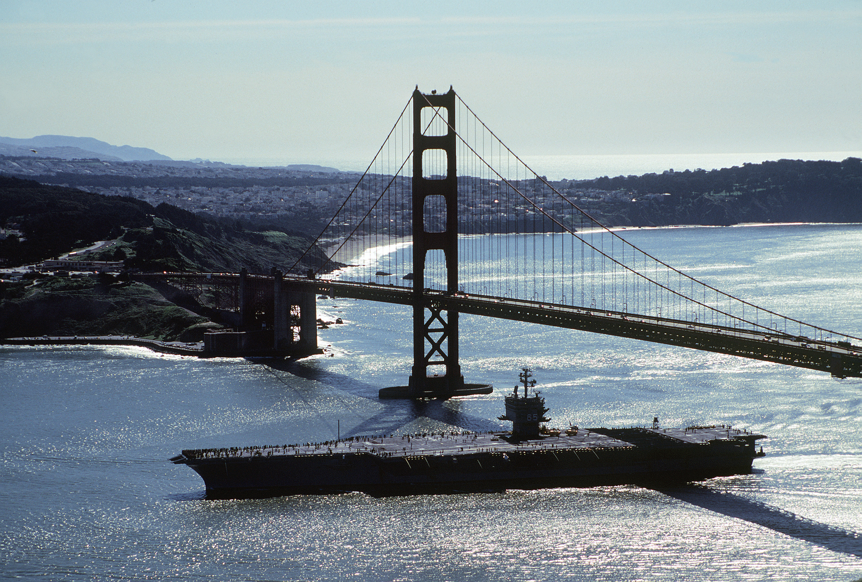 140k | A starboard beam view of USS Enterprise (CVN-65) approaching the entrance to the San Francisco Bay, 4 March 1982. US Navy photo by PH3 Curt Fargo (DVIC id: DN-ST-82-05108). |