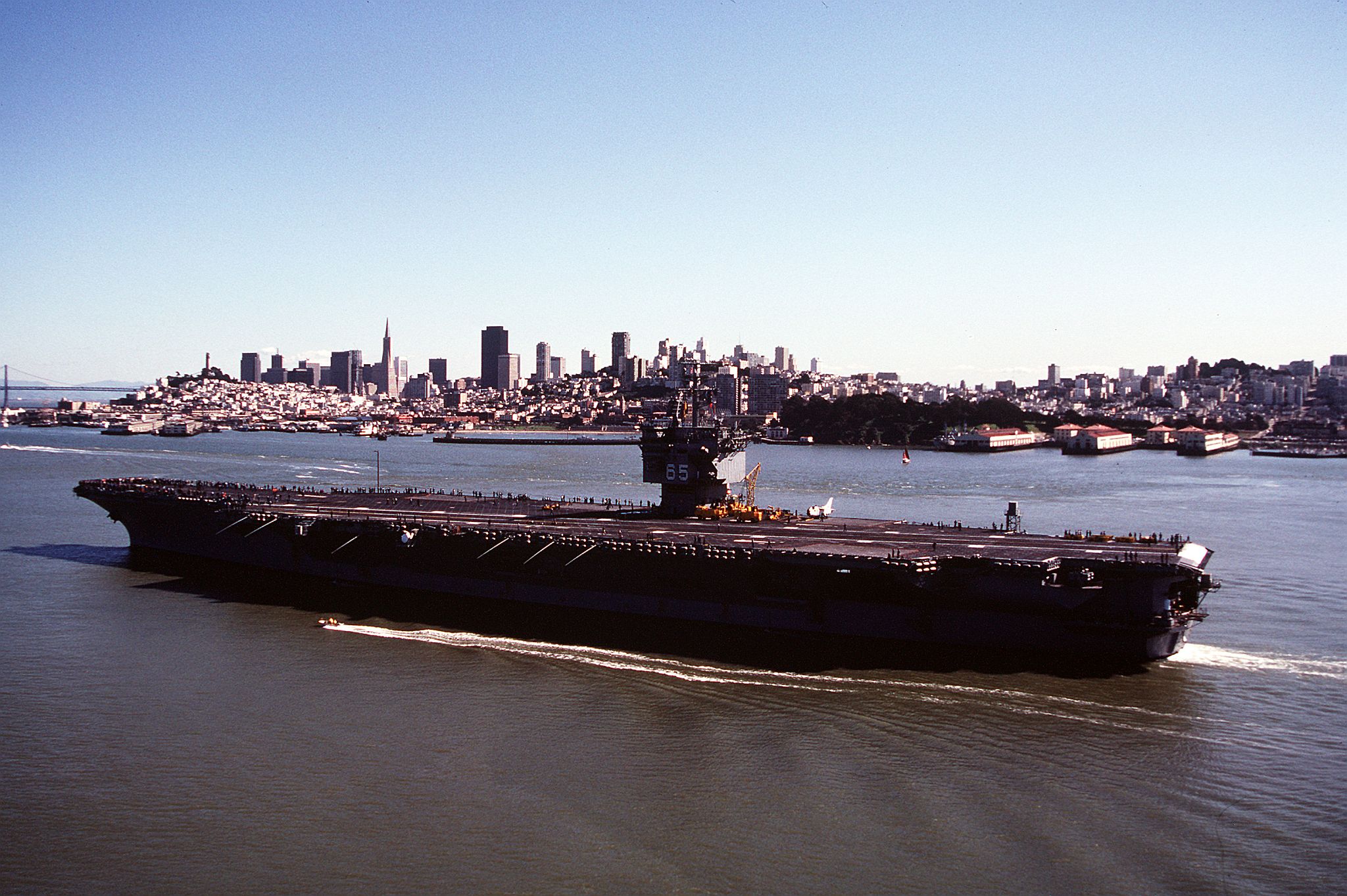 167k | Aerial starboard quarter view of USS Enterprise (CVN-65) underway for a Western Pacific deployment, September 1, 1982. The San Francisco-Oakland Bay Bridge is visible in the background. US Navy photo by PHAN Watts (DVIC id: DN-SN-85-07563). |
