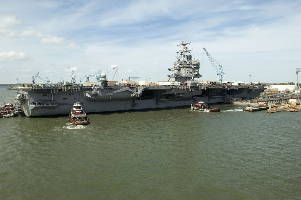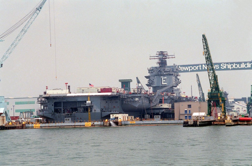 286k | Ex-USS Enterprise (CVN-65) being inactivated at Newport News. Huntington-Ingalls Industries-Newport News Shipbuilding (HII-NNS) photo by Matt Hildreth, dated 8 February 2019 (# DCS19-60-84). |