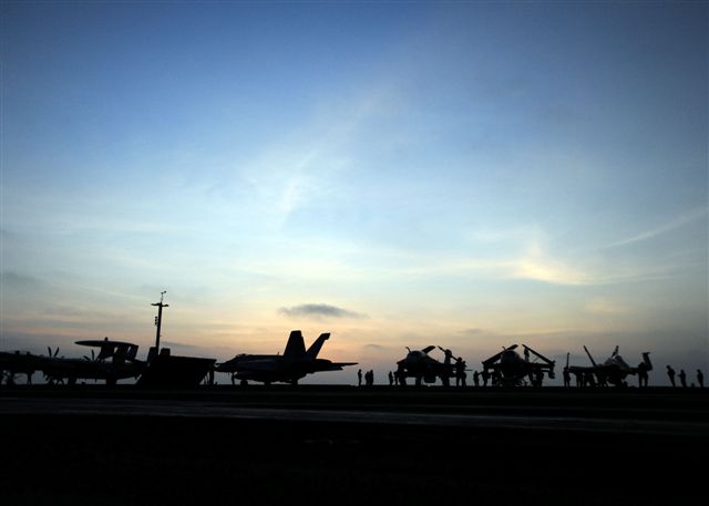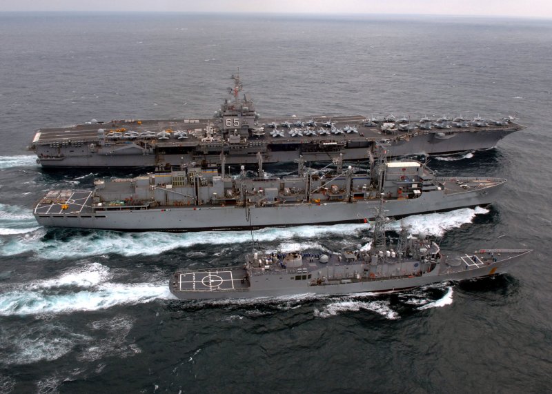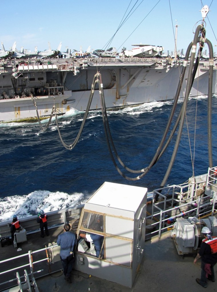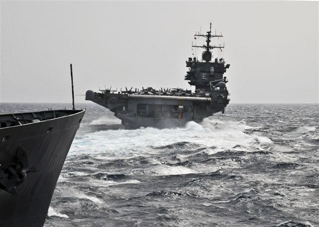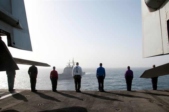 53k | Chief Aviation Support Equipment Technician David Thorne, assigned to the Safety Department aboard USS Enterprise (CVN-65), observes a replenishment at sea with Military Sealift Command (MSC) fast combat support ship USNS Supply (T-AOE 6), 12 September 2012. Enterprise was deployed to the U.S. 5th Fleet Area Of Responsibility conducting maritime security operations, theater security cooperation efforts and support missions as part of Operation Enduring Freedom. US Navy photo by Mass Communication Specialist 3rd Class Scott Pittman (# 120912-N-FI736-013). |