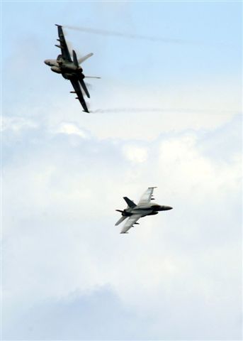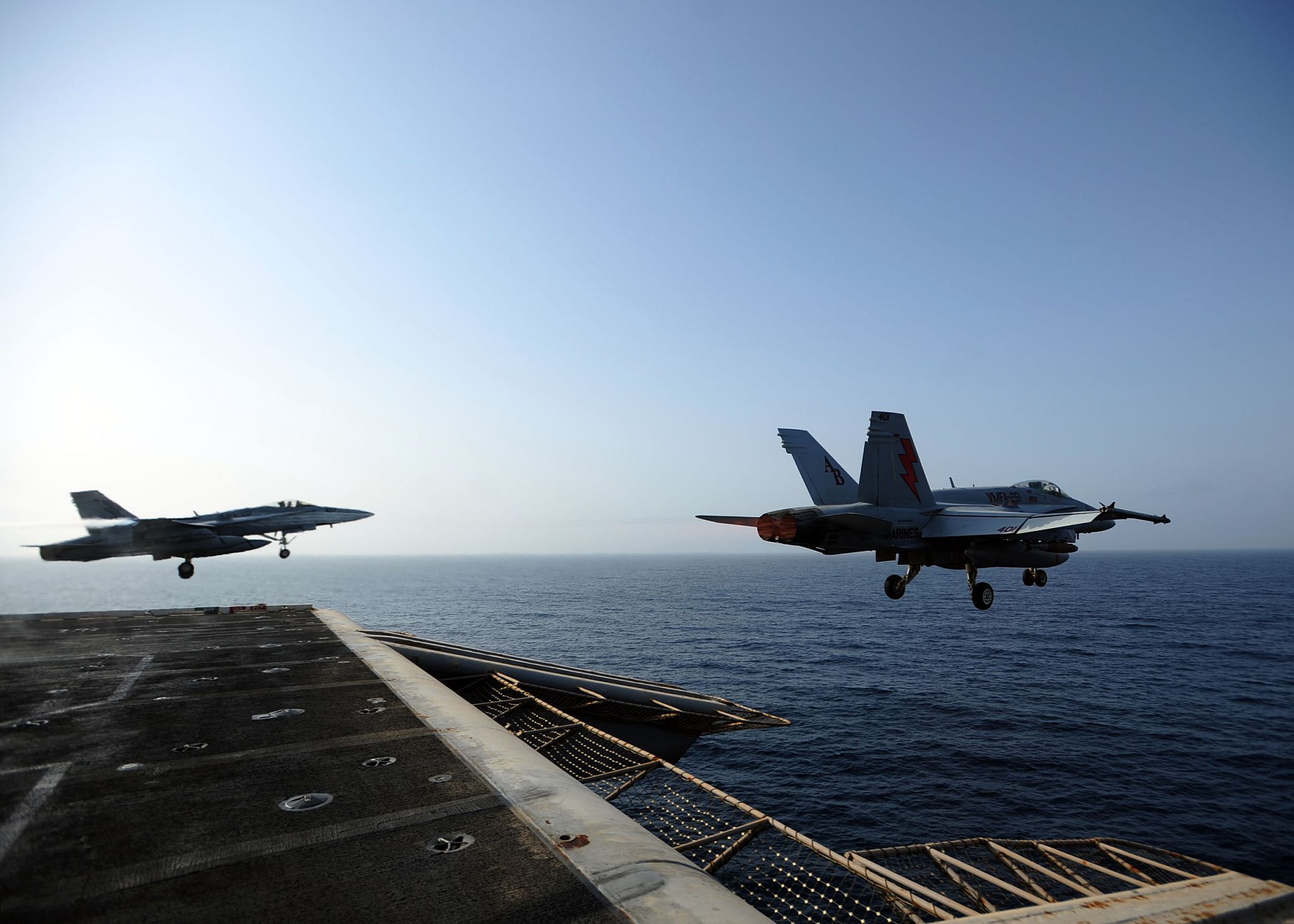 273k | LtCol Simon Doran, commanding officer of the "Thunderbolts" of Marine Fighter Attack Squadron (VMFA) 251, launches in an F/A-18C(N) Hornet (BuNo 164979, modex AB-401) from the flight deck of USS Enterprise (CVN-65) in the Arabian Sea, 8 September 2012. The aircraft carrier was deployed to the U.S. 5th Fleet area of responsibility conducting maritime security operations, theater security cooperation efforts and support missions as part of Operation Enduring Freedom. The second Hornet, in the background, appears to be BuNo 164950, modex AB-407. U.S. Navy photo by Mass Communication Specialist 3rd Class Jared King (# 120908-N-CH661-088). |