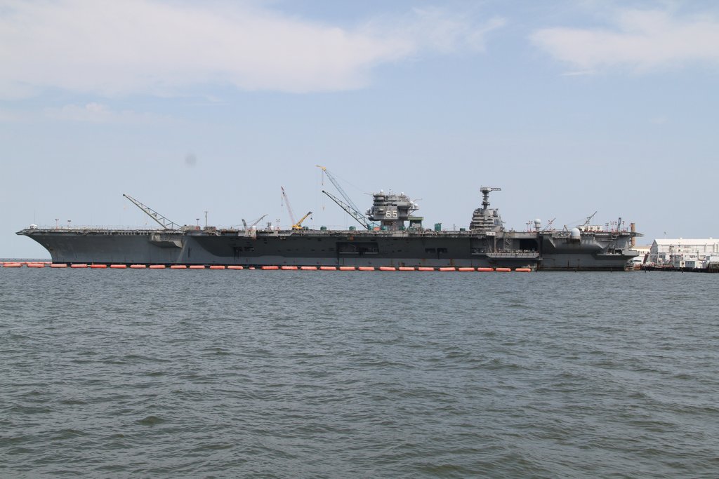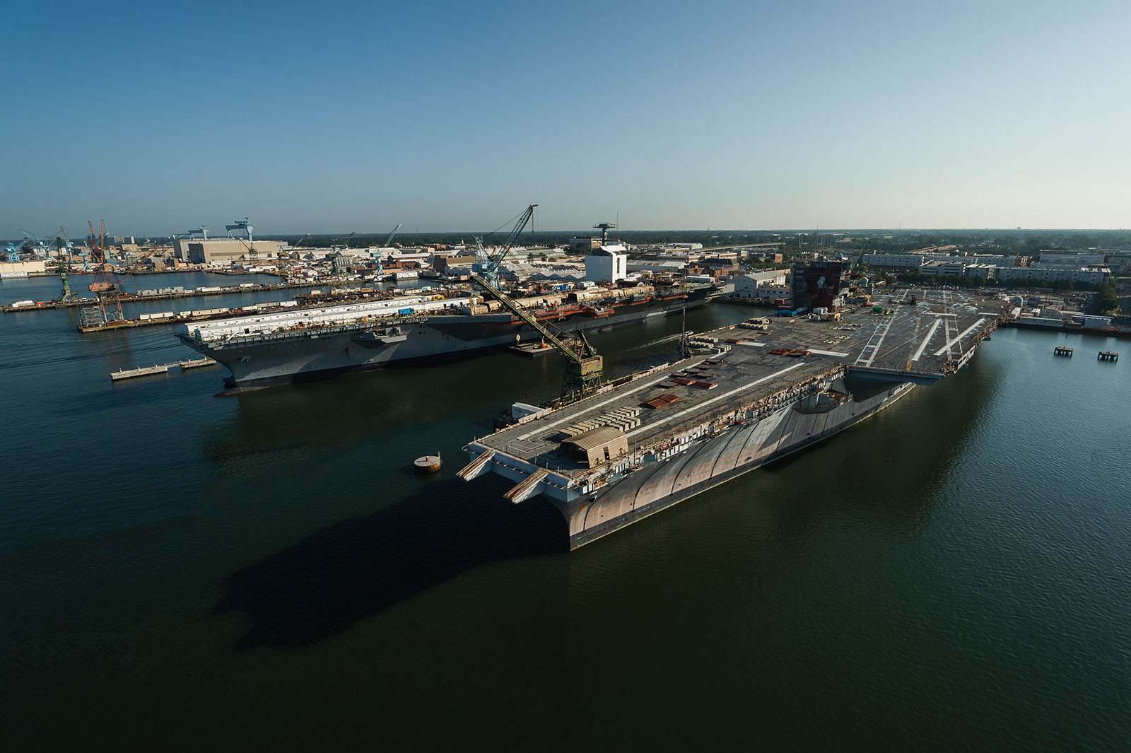 388k | Newport News Shipbuilding, 27 July 2018. Ex-USS Enterprise (CVN-65), left. USS Gerald R. Ford (CVN-78) undergoing her post-shakedown availability. Huntington-Ingalls Industries-Newport News Shipbuilding (HII-NNS) photo by Matt Hildreth. |