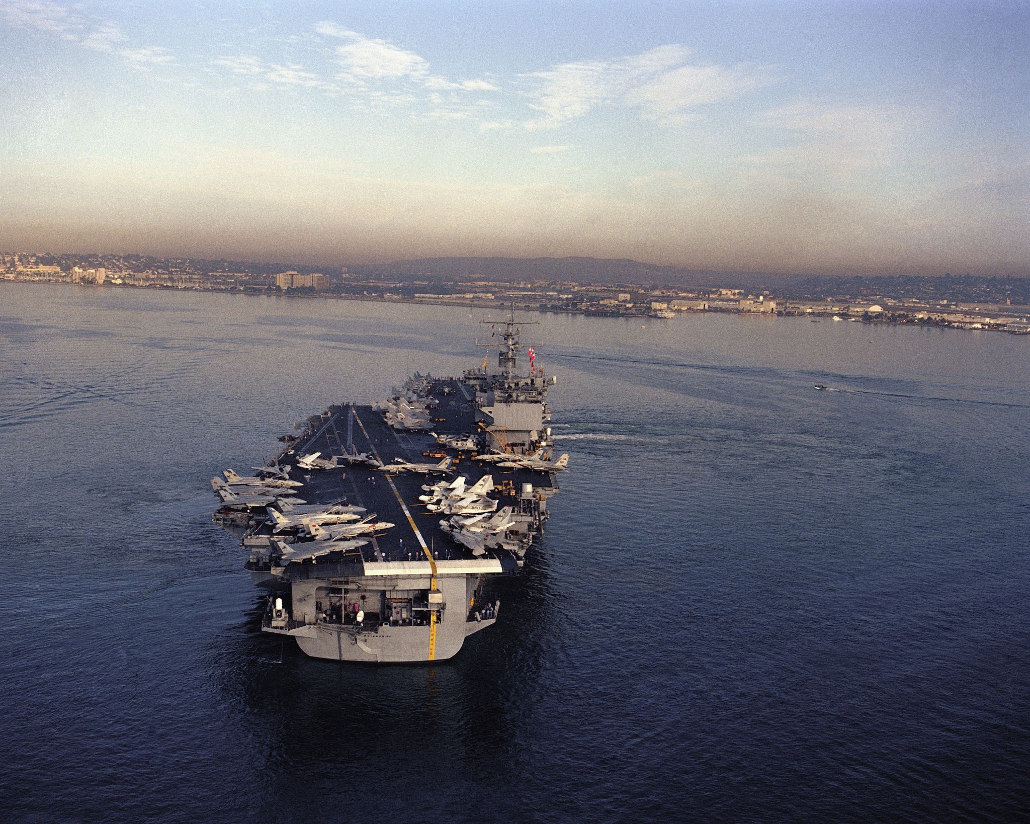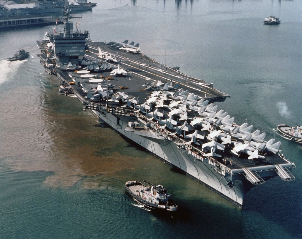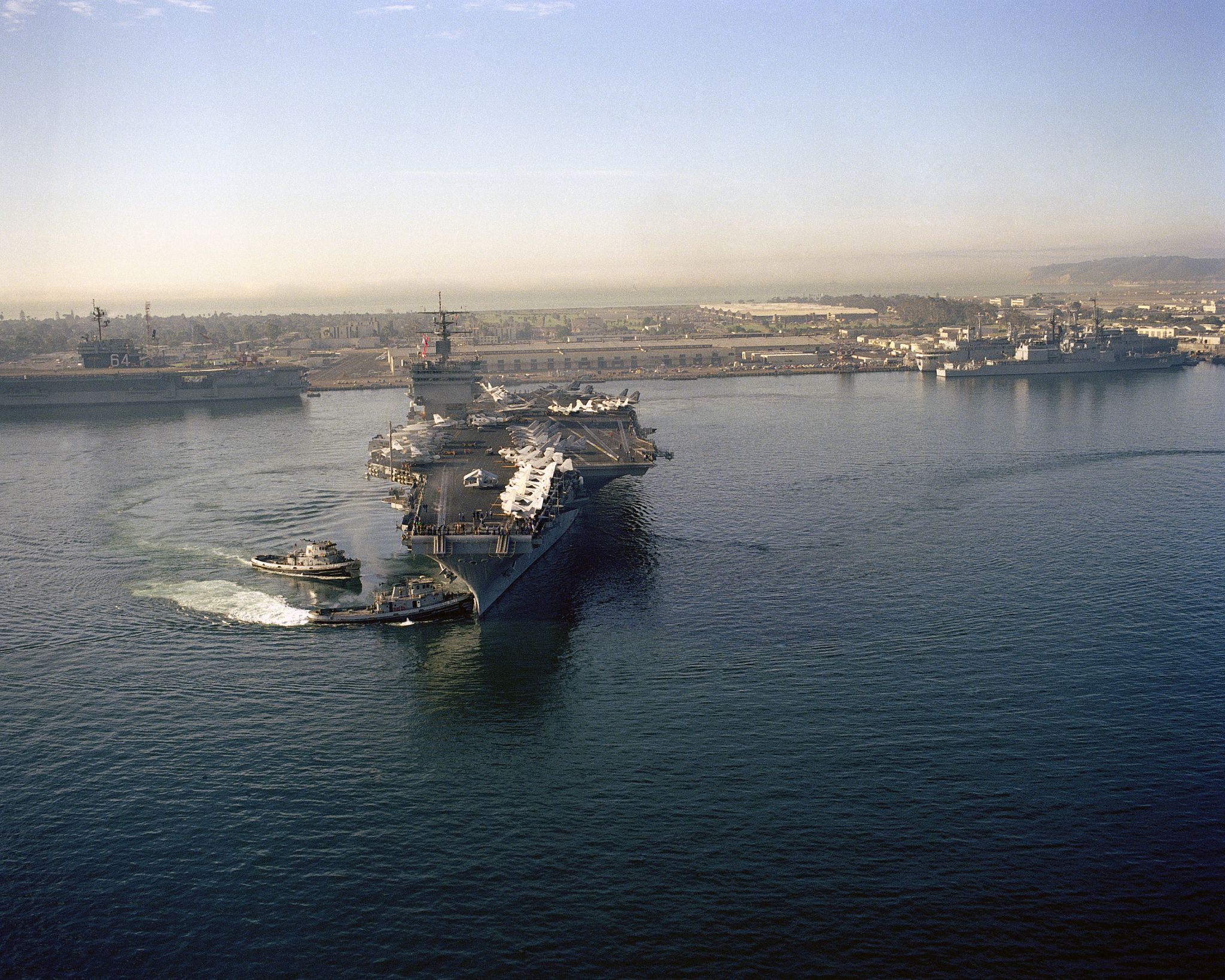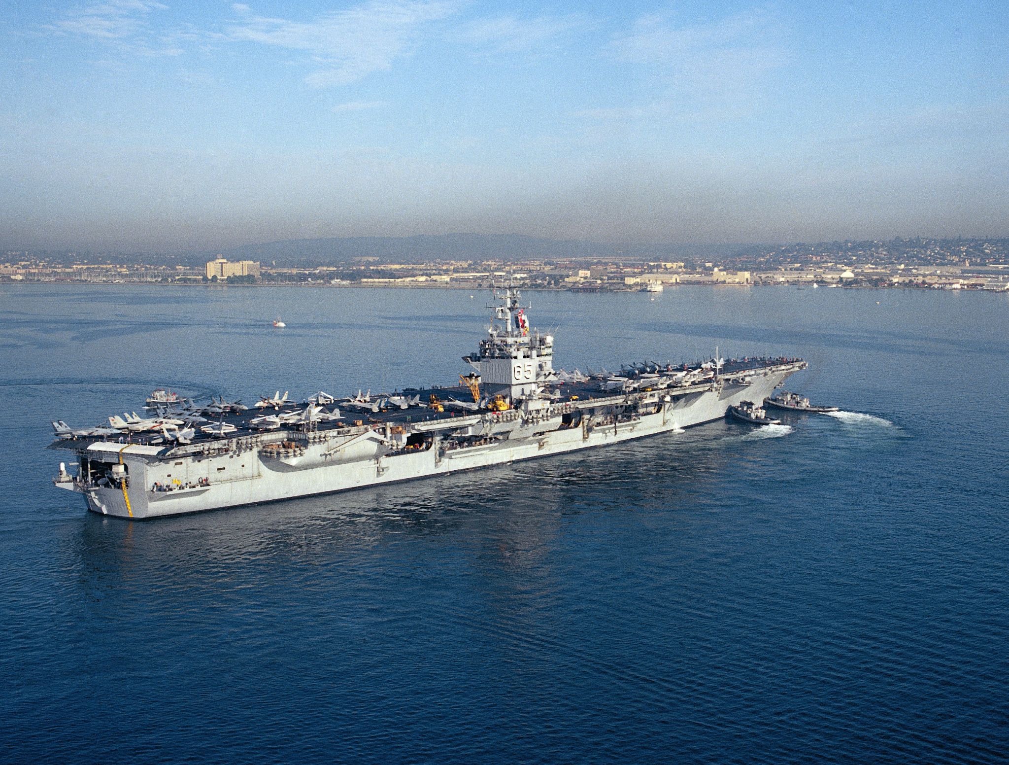657k | USS Enterprise (CVN-65) departing Naval Air Station, North Island, San Diego, California, second half of January 1984. Two large harbor tugs are assisting the carrier. U.S. Navy photo by PH1 Bennett (# DN-SC-85-07382). |