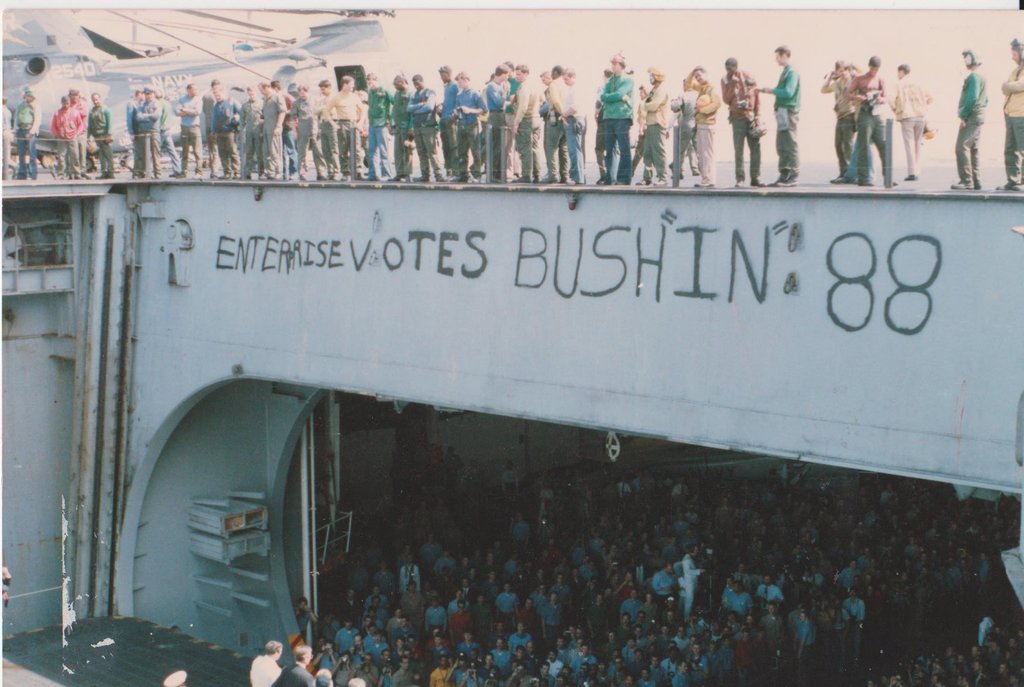 118k | USS Enterprise (CVN-65), view of island after the 1979–1982 modernization (little detail). Date and location unknown. |