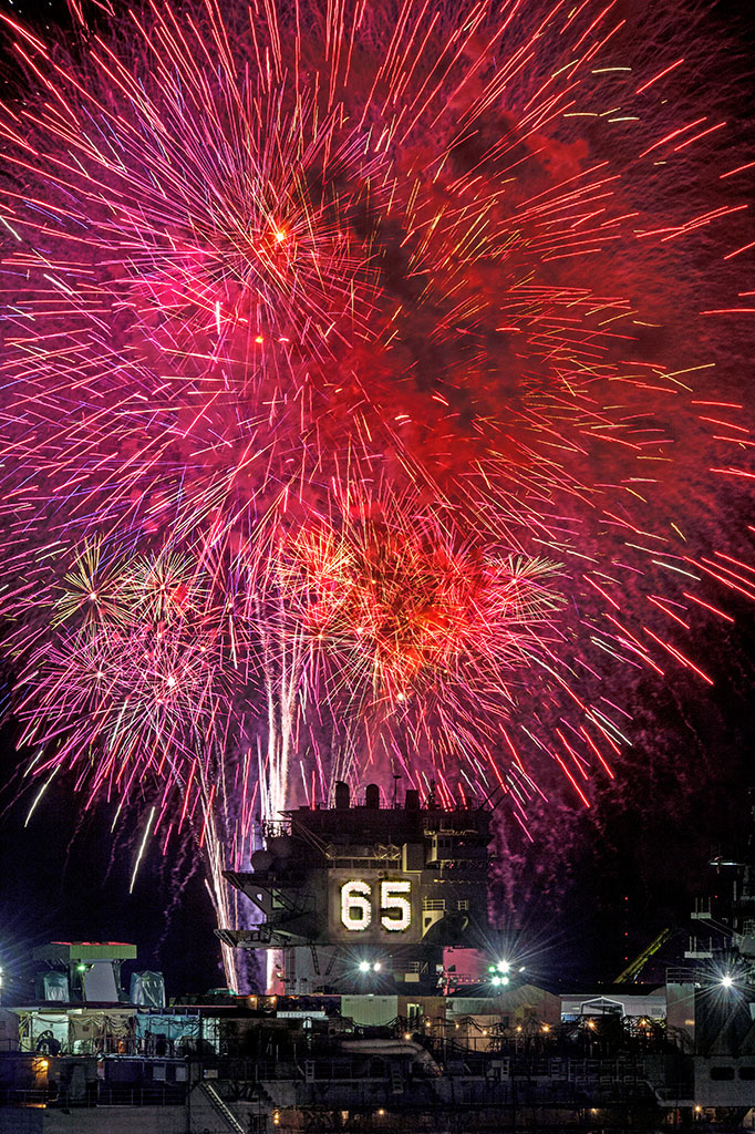 413k | The Independence Day fireworks finale creates a brilliant canopy of color around the island house of ex-USS Enterprise (CVN-65), 4 July 2014. Courtesy of ©Newport News Shipbuilding, photo by John Whalen (# DCS14-450-129). |