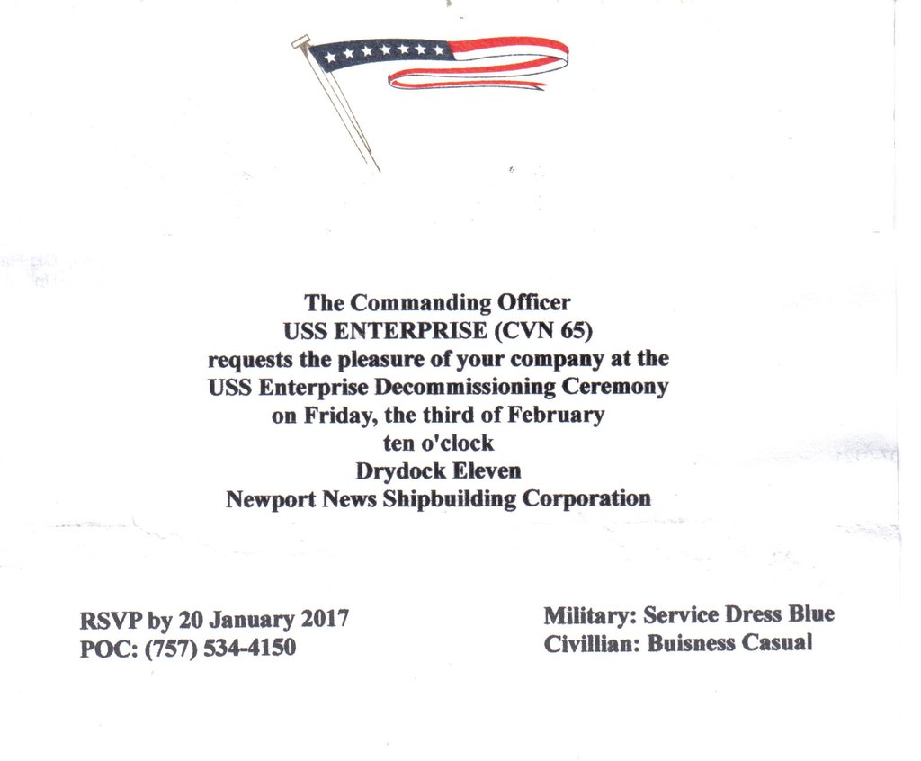 65k | USS Enterprise (CVN-65) Decommissioning Ceremony, invitation. |
