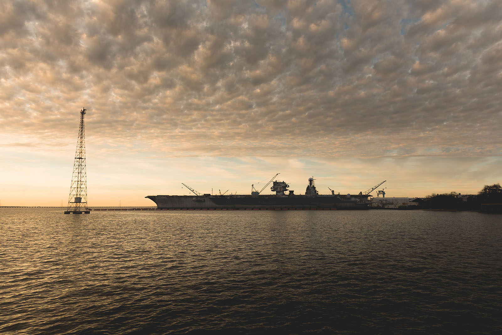 341k | View from Victory Landing Park as the sun sets on the shipyard, 3 December 2018. Huntington-Ingalls Industries-Newport News Shipbuilding (HII-NNS) photo by Matt Hildreth. |