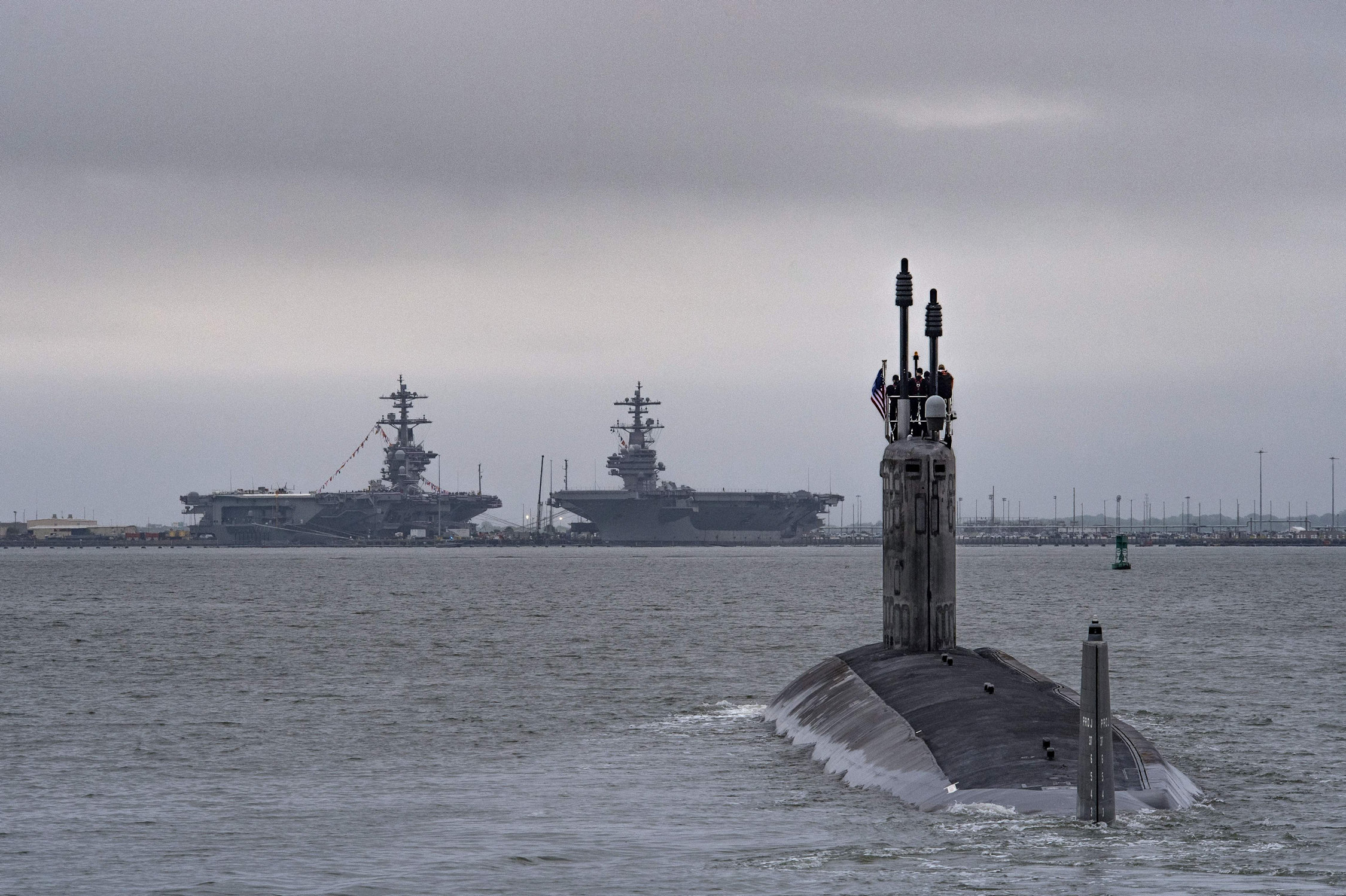 803k | PCU Indiana (SSN-789) departs for Alpha Sea Trials, 22 May 2018. Carriers in the background are USS George H.W. Bush (CVN-77), right, and USS Abraham Lincoln (CVN-72), fully dressed for a Carrier Strike Group 12 change of command ceremony. Photo by John Whalen, © and courtesy of Newport News Shipbuilding, Huntington Ingalls Industries. |
