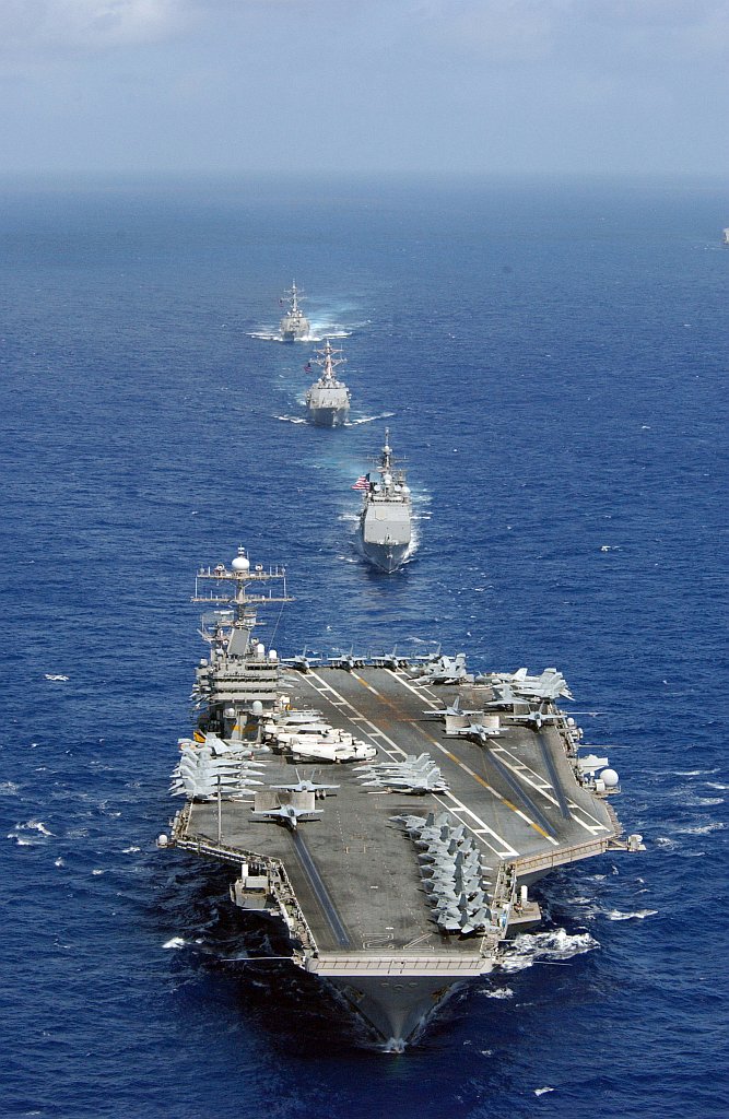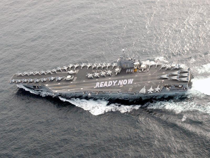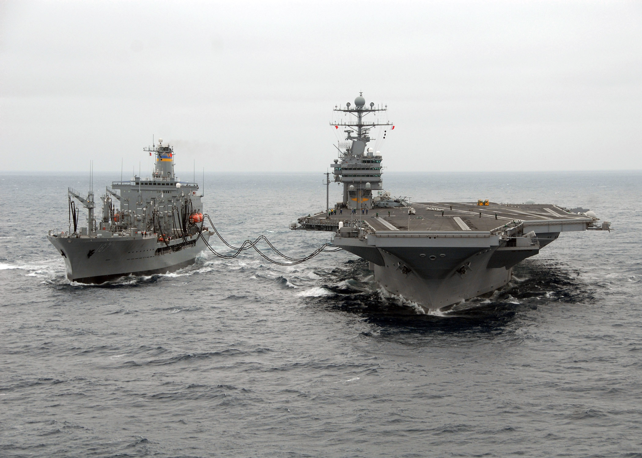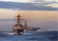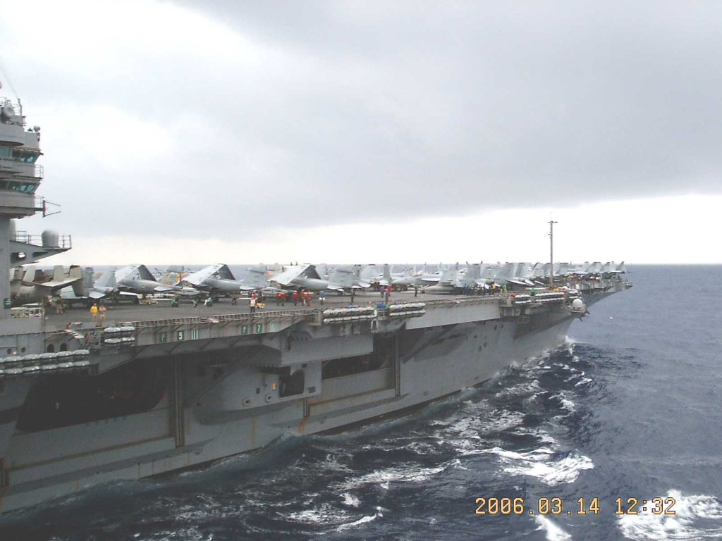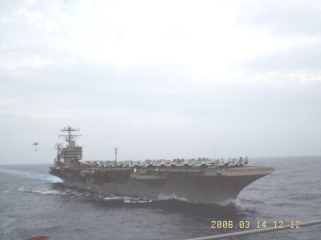 78k | The Arabian Gulf, Apr. 7, 2003 USS Abraham Lincoln (CVN-72) steams alongside USS Nimitz (CVN-68) during weapons and cargo transfers between the two ships. The Nimitz Carrier Strike Force and Carrier Air Wing Eleven (CVW-11) were relieving Abraham Lincoln and CVW-14 in support of Operation Iraqi Freedom. U.S. Navy photo by Photographer’s Mate 3rd Class Yesenia Rosas. [030407-N-2385R-002]. |