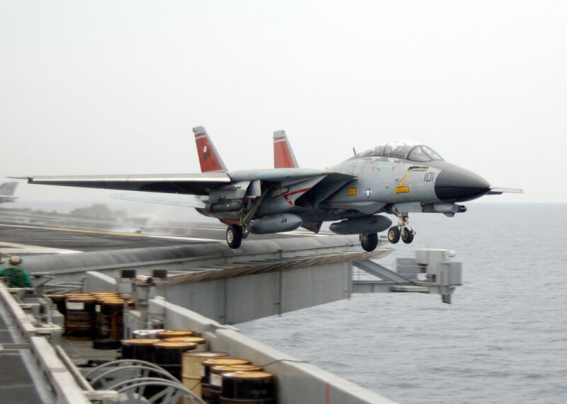 367k | A Grumman F-14D Tomcat (BuNo 164601, modex NK-100) from the "Tomcatters" of Fighter Squadron (VF) 31 flies over the Landing Signal Officer (LSO) platform aboard USS Abraham Lincoln (CVN-72) after returning from a successful proficiency flight, 26 January 2001. The Nimitz-class aircraft carrier was on the final leg of a scheduled six-month deployment to the Persian Gulf in support of Operation Southern Watch. Official U.S. Navy (USN) photo by Photographer's Mate 2nd Class Daniel Wolsey (# 010126-N-6699W-001). |