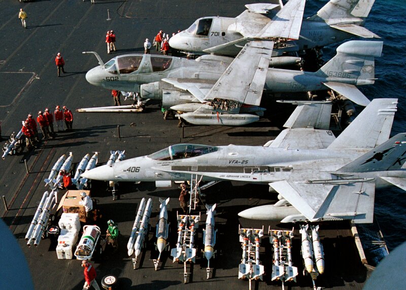 821k | Five F/A-18C(N) Hornets assigned to Strike Fighter Squadron (VFA) 25 "Fist of the Fleet," armed with air-to-air missiles, stand by for their next mission, 15 March 2003. USS Abraham Lincoln (CVN-72) and Carrier Air Wing (CVW) 14 were conducting combat operations in support of Operation Southern Watch. Aircraft are, left to right: BuNo 164645 (modex NK411), 164262 (NK412), 164660 (NK407), 164654 (NK406), and 164639 (NK405). US Navy photo by Photographer's Mate Third Class (AW/PJ) Philip A. McDaniel, #030315-N-9593M-008. Cleared for release by ALBG PAO, LCDR Jeff Bender. |
