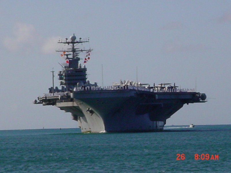 51k | USS Abraham Lincoln (CVN-72) entering Pearl Harbor, 26 April 2003, on her way home from Operation Iraqi Freedom. Photos by SK1(SW) Joseph A. Gless, USN, Mobile Diving Salvage Unit One. |
