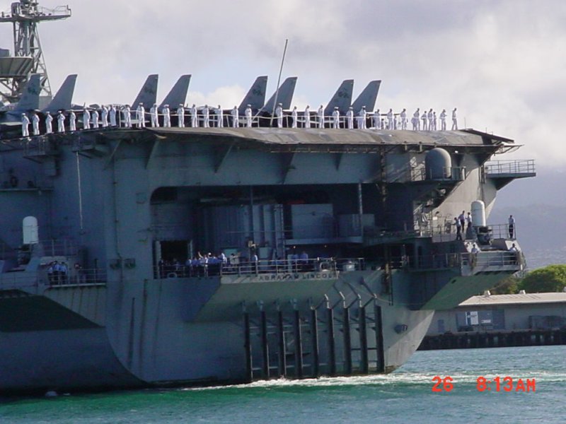 233k | Sailors aboard USS Abraham Lincoln (CVN-72) "man the rails" as they pass the Arizona Memorial and battleship Missouri (BB-63), 1 August 2002. The Nimitz-class aircraft carrier and Carrier Air Wing (CVW) 14 began a regularly scheduled deployment in July and would be conducting missions in support of Operation Enduring Freedom. U.S. Navy photo by Photographer's Mate 3rd Class Kittie VandenBosch (# 020801-N-8794V-009). |