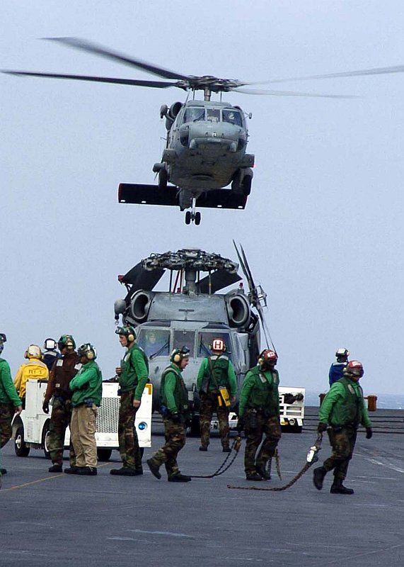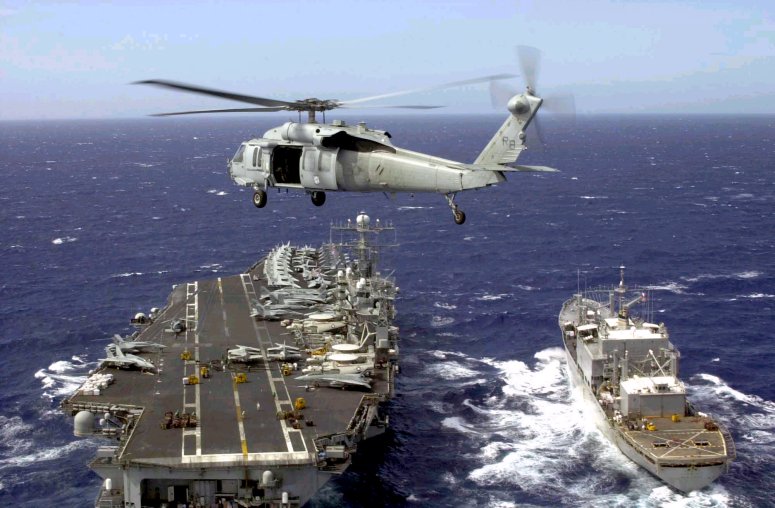 85k | An MH-60 Knight Hawk assigned to Helicopter Combat Support Squadron (HC) 5 "Providers" assists with an underway replenishment (UNREP) at sea between the Military Sealift Command (MSC) combat stores ship USNS San Jose (T‑AFS 7) and USS Abraham Lincoln (CVN-72), 24 January 2003. The Nimitz-class aircraft carrier and her embarked Carrier Air Wing (CVW) 14 were conducting flight operations and carrier qualifications in the Seventh Fleet Area Of Responsibility (AOR). The battle group had been extended on its deployment, pending possible military action in Iraq. US Navy photo, #030124-N-8794V-006, by PH3 Kittie VandenBosch |