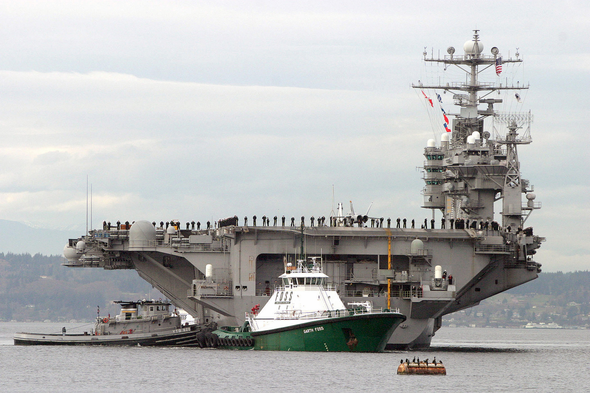 537k | Naval Station Norfolk, 19 December 2012. Ships are, right to left: USS Dwight D. Eisenhower (CVN-69), USS George H.W. Bush (CVN-77), ex-USS Enterprise (CVN-65), USS Bataan (LHD-5), USS Abraham Lincoln (CVN-72), USS Harry S. Truman (CVN-75), and USS Wasp (LHD-1). U.S. Navy photo by Mass Communication Specialist 3rd Class Kevin J. Steinberg, # 121219-N-TB177-875. |
