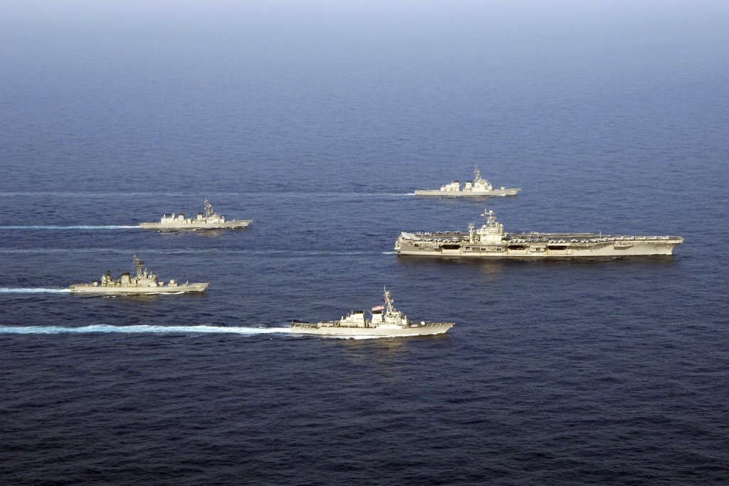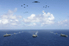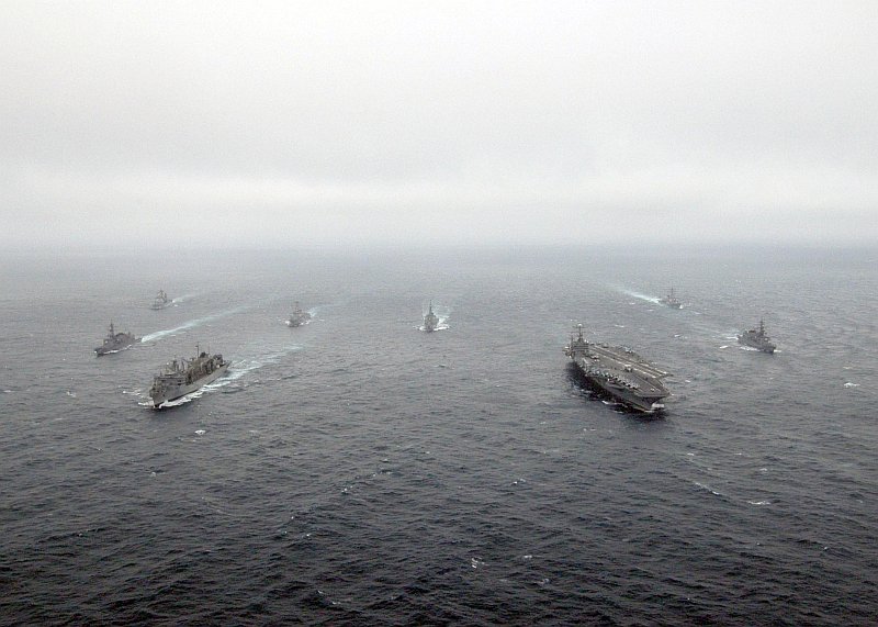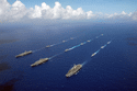 47k | Left to right: USS Abraham Lincoln (CVN-72), USS New York (LPD-21), and USS Enterprise (CVN-65) steam in formation in the North Arabian Sea, 9 June 2012. In the background, left to right: USS Cape St. George (CG-71), USS Porter (DDG-78), and USS Vicksburg (CG-69). US Navy photo by Mass Communication Specialist 3rd Class Scott Pittman (# 120609-N-FI736-580). |
