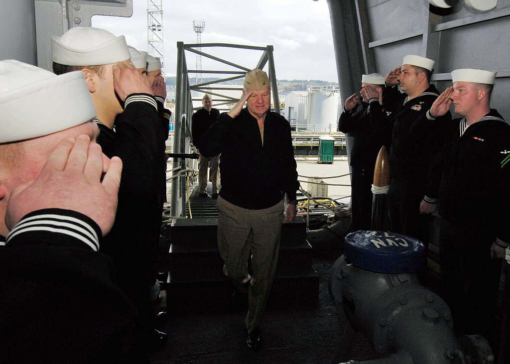 88k | The Pacific Ocean, May 1, 2003 President George W. Bush passes through the side boys after landing aboard USS Abraham Lincoln (CVN-72) in "NAVY 1", an S-3B Viking from the "Blue Wolves" of Sea Control Squadron Three Five (VS-35). The custom of having side boys originated centuries ago in the Royal Navy when officers were hoisted aboard in a sort of basket, and since senior officers usually weighed more than juniors, more boys were needed on the line. When the side is piped by the boatswain’s mate of the watch, from two to eight side boys, depending on the rank of the officer, will form a passageway at the gangway. U.S. Navy photo by Photographer's Mate 3rd Class Tyler J. Clements. [030501-N-6817C-049]. |