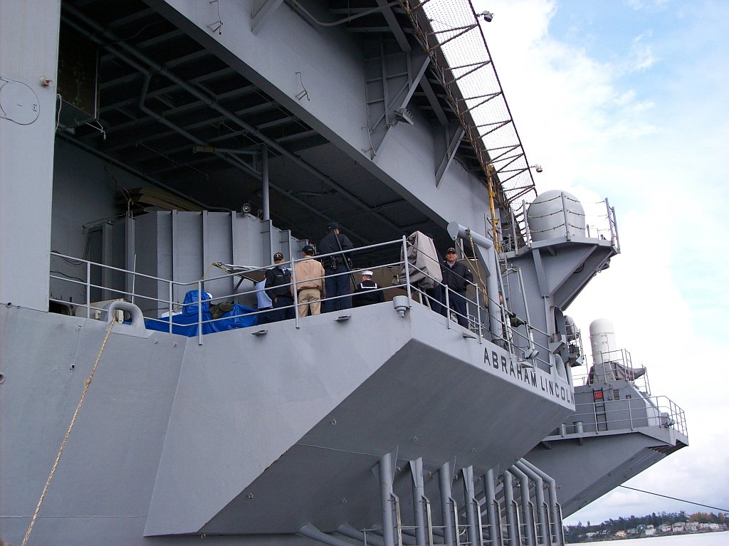 700k | USS Abraham Lincoln (CVN-72) is moored at Naval Station Pearl Harbor for a brief port visit, 30 September 2008, before completing a seven-month deployment supporting maritime security operations and theater security cooperation in the U.S. 5th and 7th Fleet areas of responsibility. The Nimitz-class aircraft carrier also participated in action supporting operations Iraqi Freedom and Enduring Freedom. U.S. Navy photo by Chief Mass Communication Specialist David Rush (# 080930-N-0879R-001). |