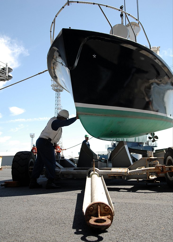 368k | The emergency heavy lift crane aboard USS Abraham Lincoln (CVN-72) is lifted off the flight deck by a Westmont floater crane from Puget Sound Naval Shipyard, 9 October 2007. The crane would undergo load testing at Naval Station Everett to recertify it for shipboard use before being loaded back aboard the Nimitz-class aircraft carrier. U.S. Navy photo by Mass Communication Specialist Seaman Brandon Wilson (# 071009-N-1745W-314). |