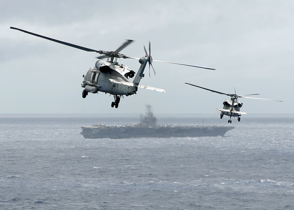 100k | A pair of HH-60H Seahawks assigned to the "Golden Falcons" of Helicopter Anti-submarine Squadron 2 (HS-2) approach USS Abraham Lincoln (CVN-72), 22 April 2008, in the Pacific Ocean. The Nimitz-class aircraft carrier and Carrier Strike Group Nine were on a scheduled seven-month deployment to the U.S. 5th Fleet area of responsibility. U.S. Navy photo by Mass Communication Specialist 2nd Class James R. Evans (# 080422-N-7981E-216). |