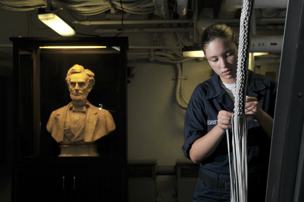 78k | Boatswain's Mate Seaman Shannon Siegrist puts braided "fancy work" on the railing of a ladder well aboard USS Abraham Lincoln (CVN-72), 25 June 2008. The Nimitz-class aircraft carrier was steaming in the Persian Gulf, in the U.S. 5th Fleet area of responsibility, supporting maritime security. U.S Navy photo by Mass Communication Specialist 2nd Class James R. Evans (# 080625-N-7981E-217). |