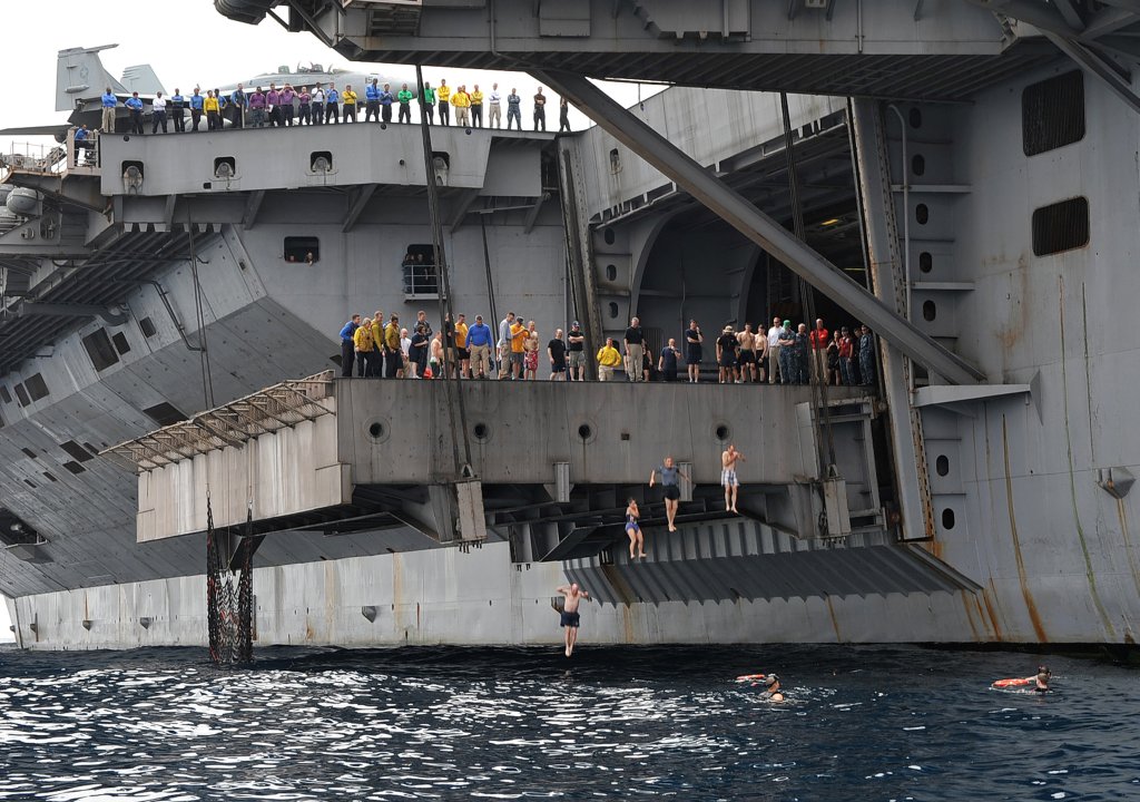 174k | CAPT John D. Alexander, left, commanding officer of the aircraft carrier USS Abraham Lincoln (CVN-72); Command Master Chief Susan Whitman; CAPT Timothy Kuehhas, executive officer; and RADM Mike Shoemaker, commander of Carrier Strike Group 9, jump from one of the ship's aircraft elevators during an all-hands swim call, 24 April 2012, in the Arabian Sea. The Nimitz-class aircraft carrier was deployed to the U.S. 5th Fleet Area Of Responsibility conducting maritime security operations, theater security cooperation efforts and support missions as part of Operation Enduring Freedom. U.S. Navy photo by Mass Communication Specialist Seaman Zachary S. Welch (# 120424-N-KQ416-039). |